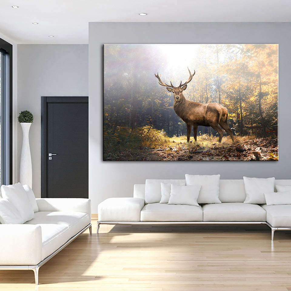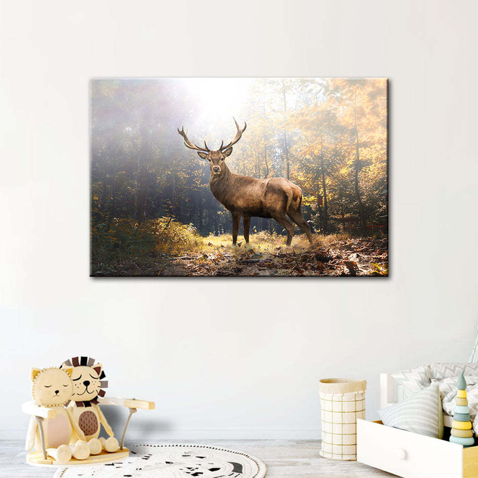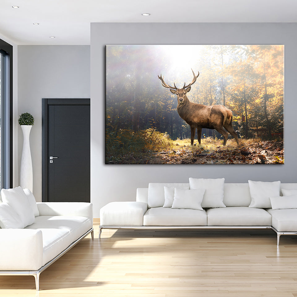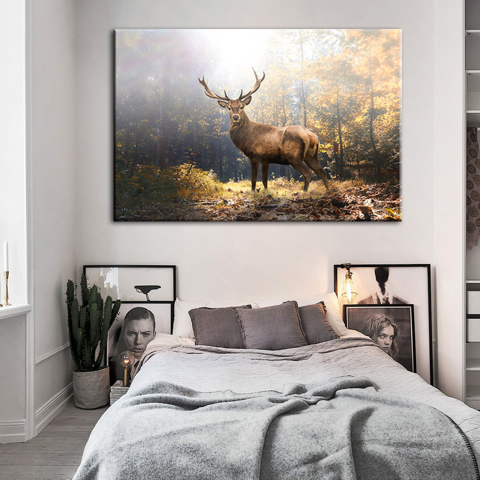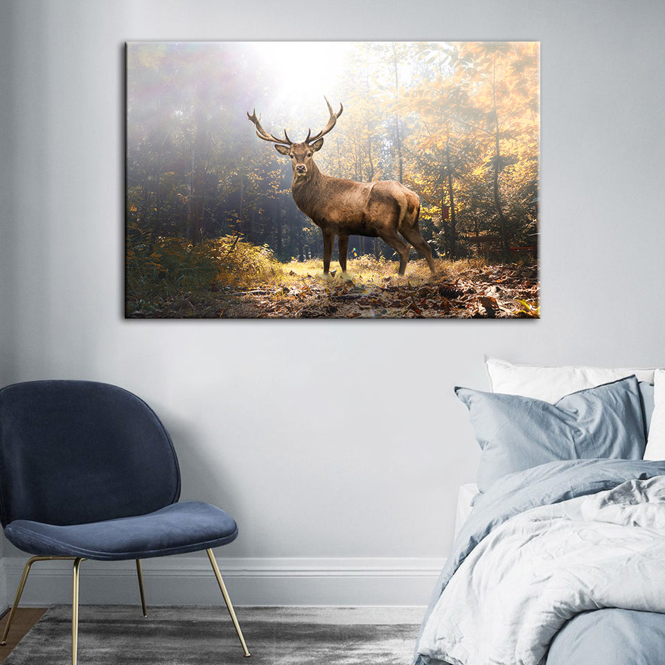 Majestic Deer in the Woods - Canvas Wall Art Painting is a premium canvas that adds a touch of wildlife art to your décor. The canvas features gorgeous large deer haloed in light in the woods. The Wall Art is perfect to decorate your bedroom, dining room, living room, office, dormitory, hotel lobby, and more! Mix and match your favorite pieces to create an eye-catching feature wall.