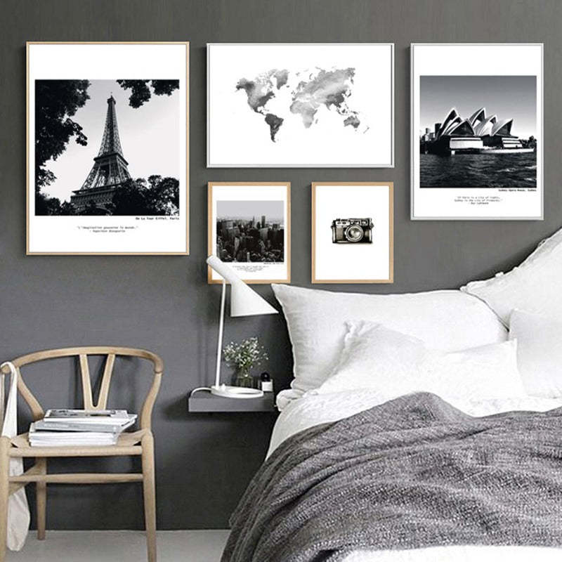 Modern Travel City Scene World Map  - Canvas Wall Art Painting is classic frames in black and white color featuring abstract things from modern city. These can be put up on any color wall and will definitely make it look better. These are perfect for those who like to decorate their place with minimum changes.