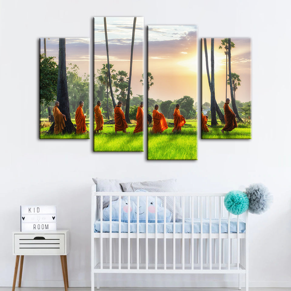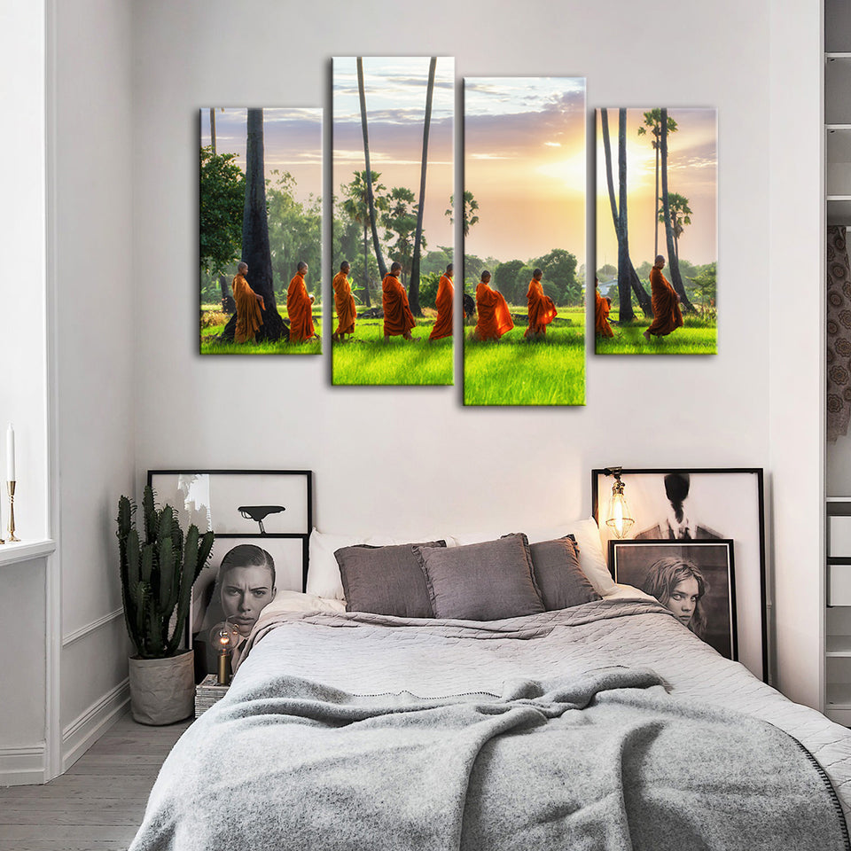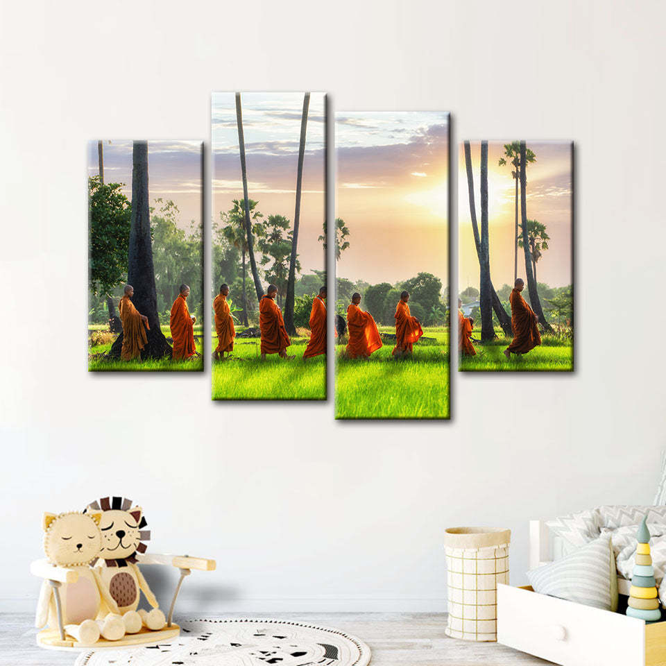 Morning Walk 4 Piece - Canvas Wall Art Painting is a premium canvas that adds a fresh touch to your decor. The canvas features people walking in line in front of a bright shining sun.