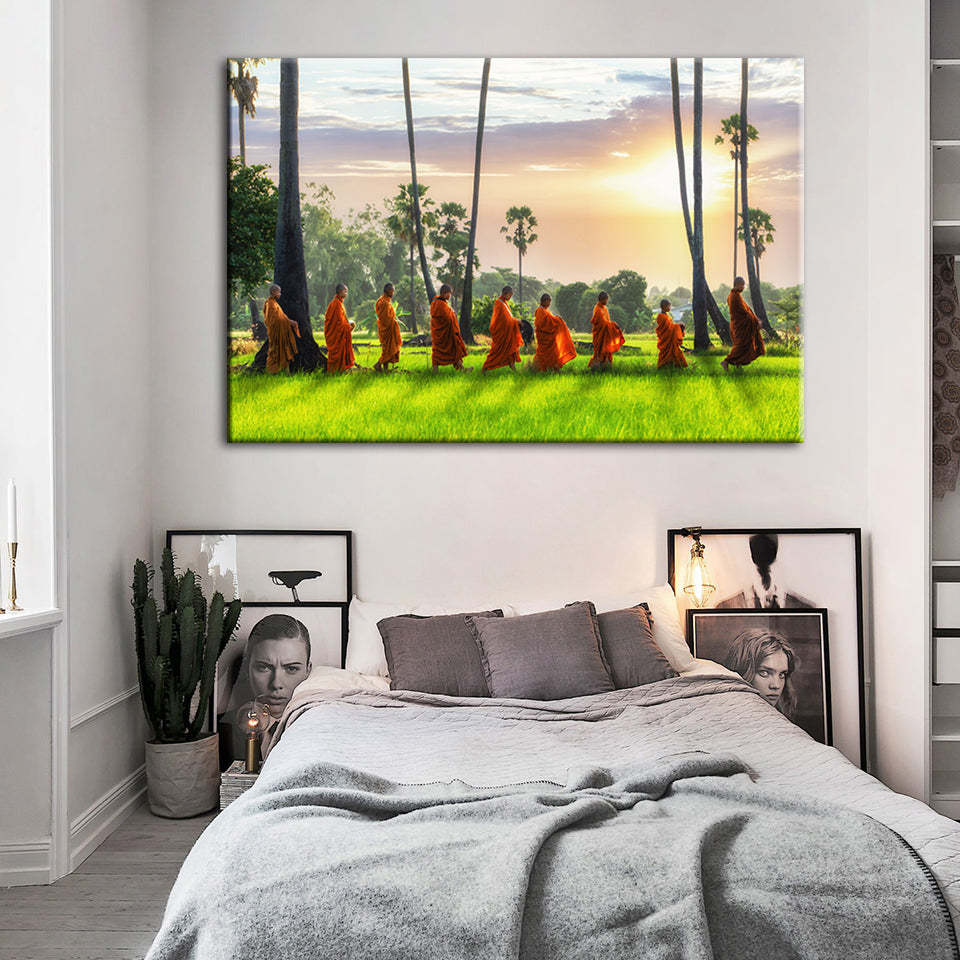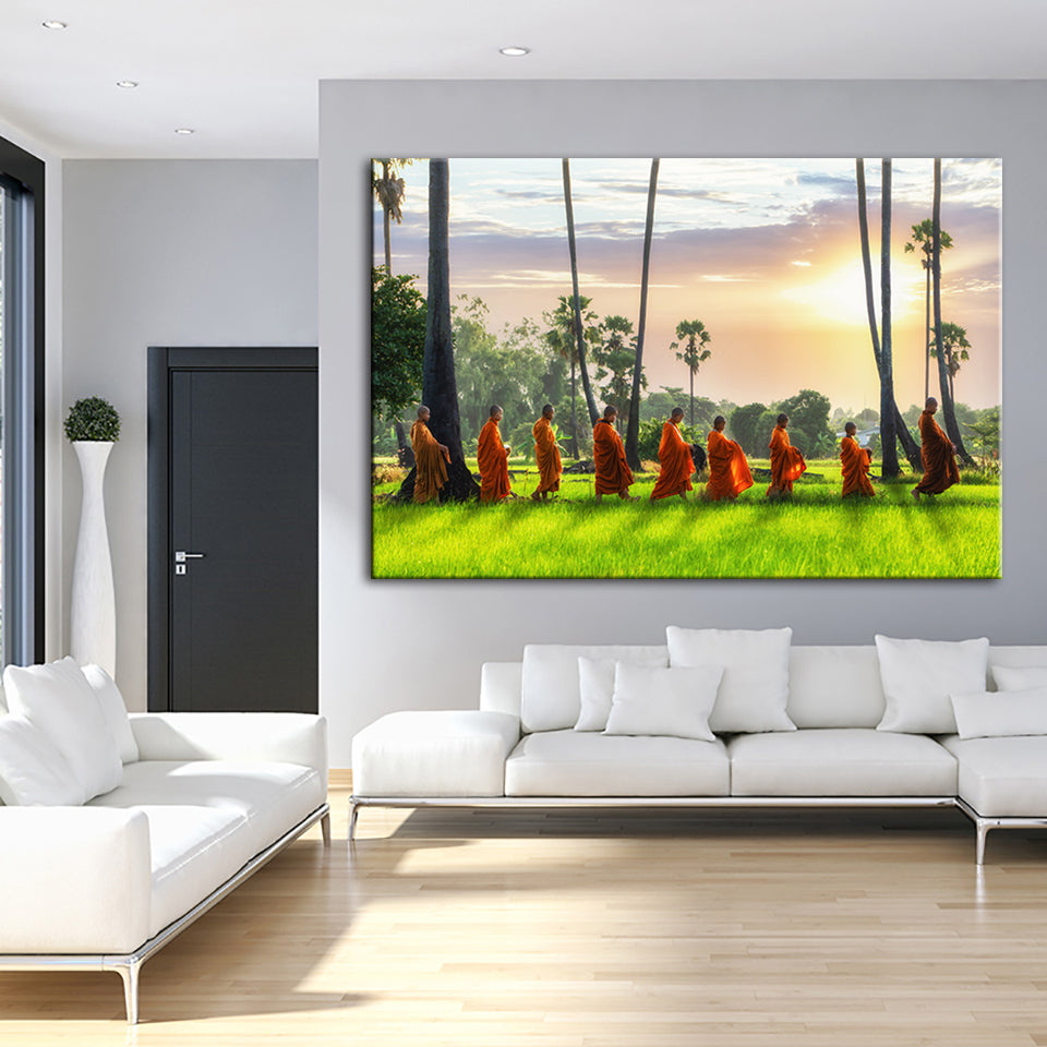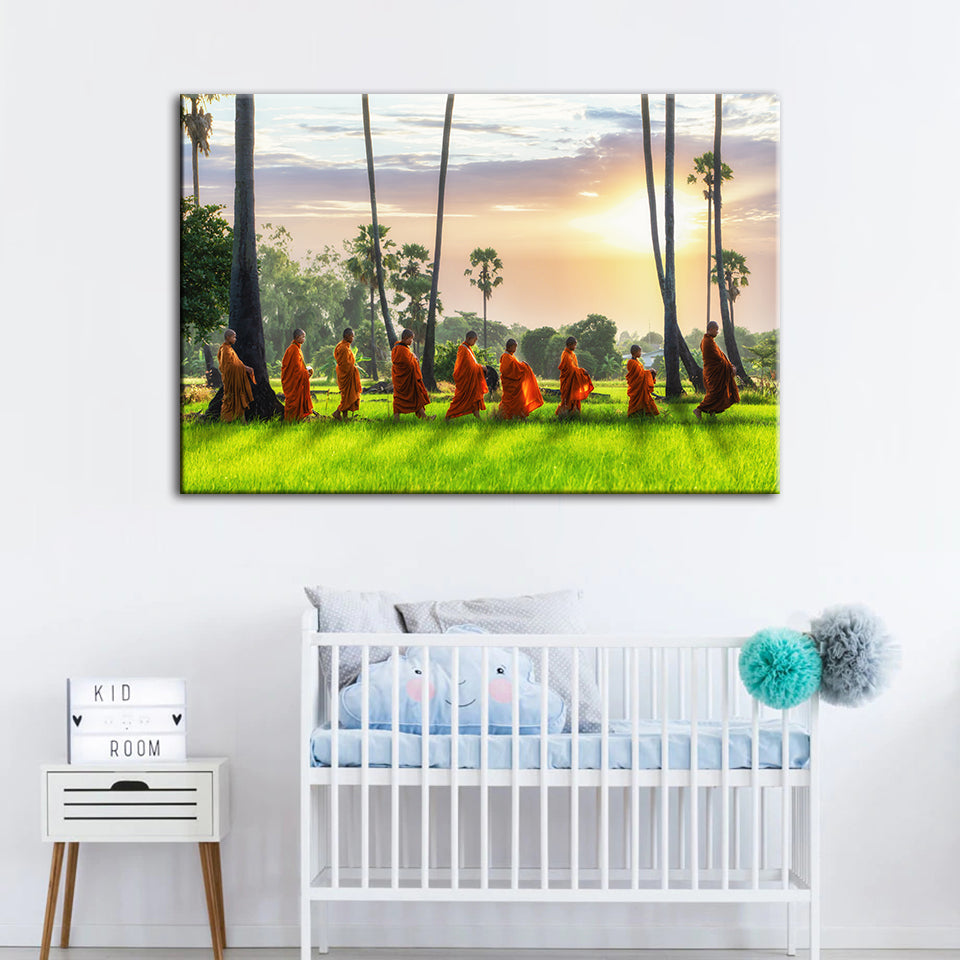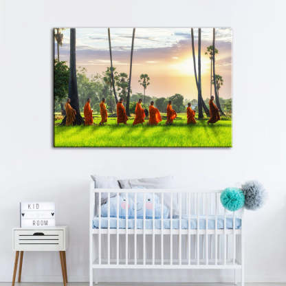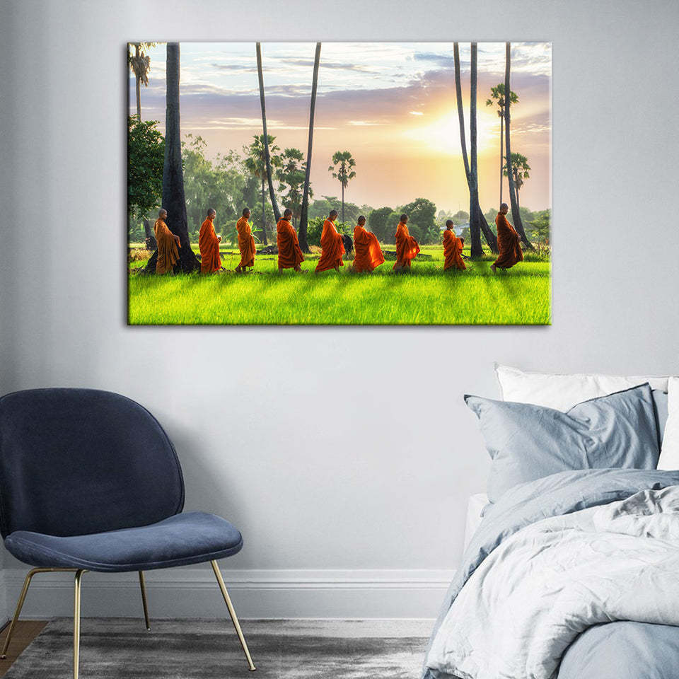 Morning Walk - Canvas Wall Art Painting is a premium canvas that adds a fresh touch to your decor. The canvas features people walking in line in front of a bright shining sun.