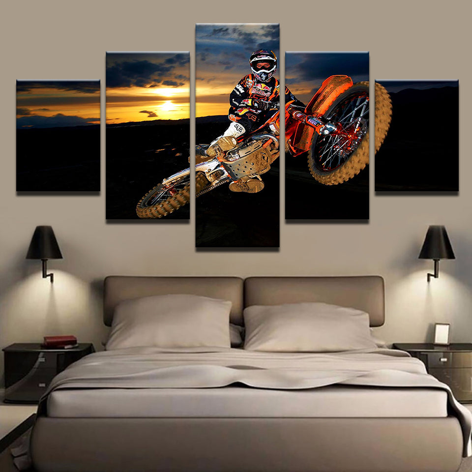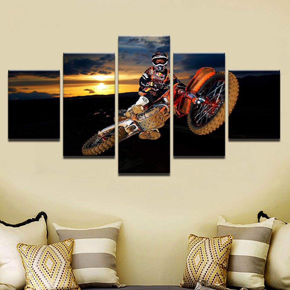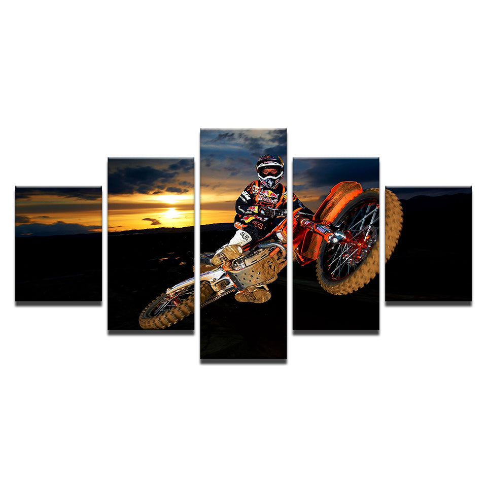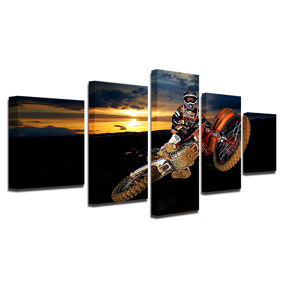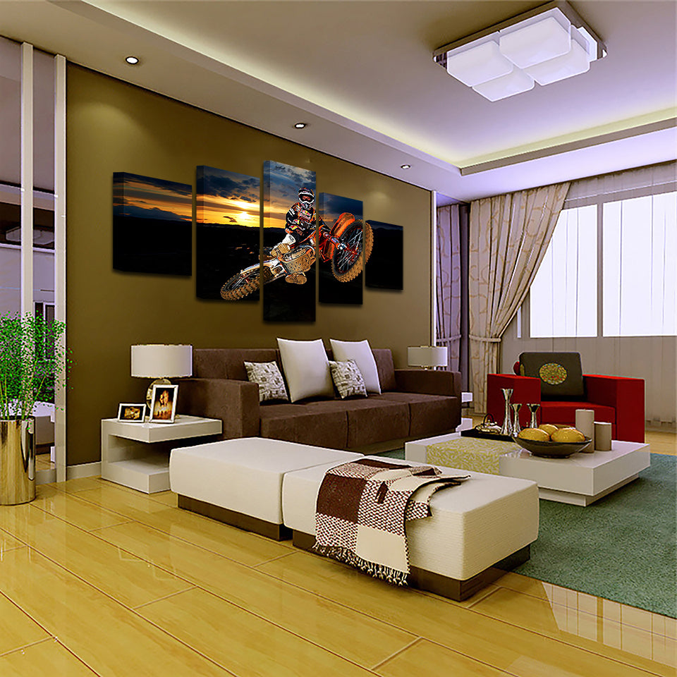 Motorbike Soaring 5 Piece - Canvas Wall Art Painting is a premium canvas that adds a touch of adventure to your décor. The canvas features a biker soaring in the air on his motorbike with the sun setting in the background.