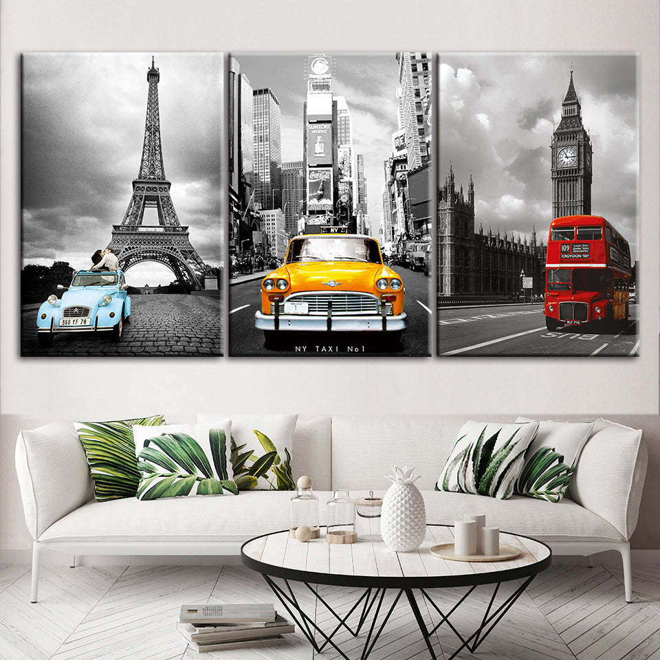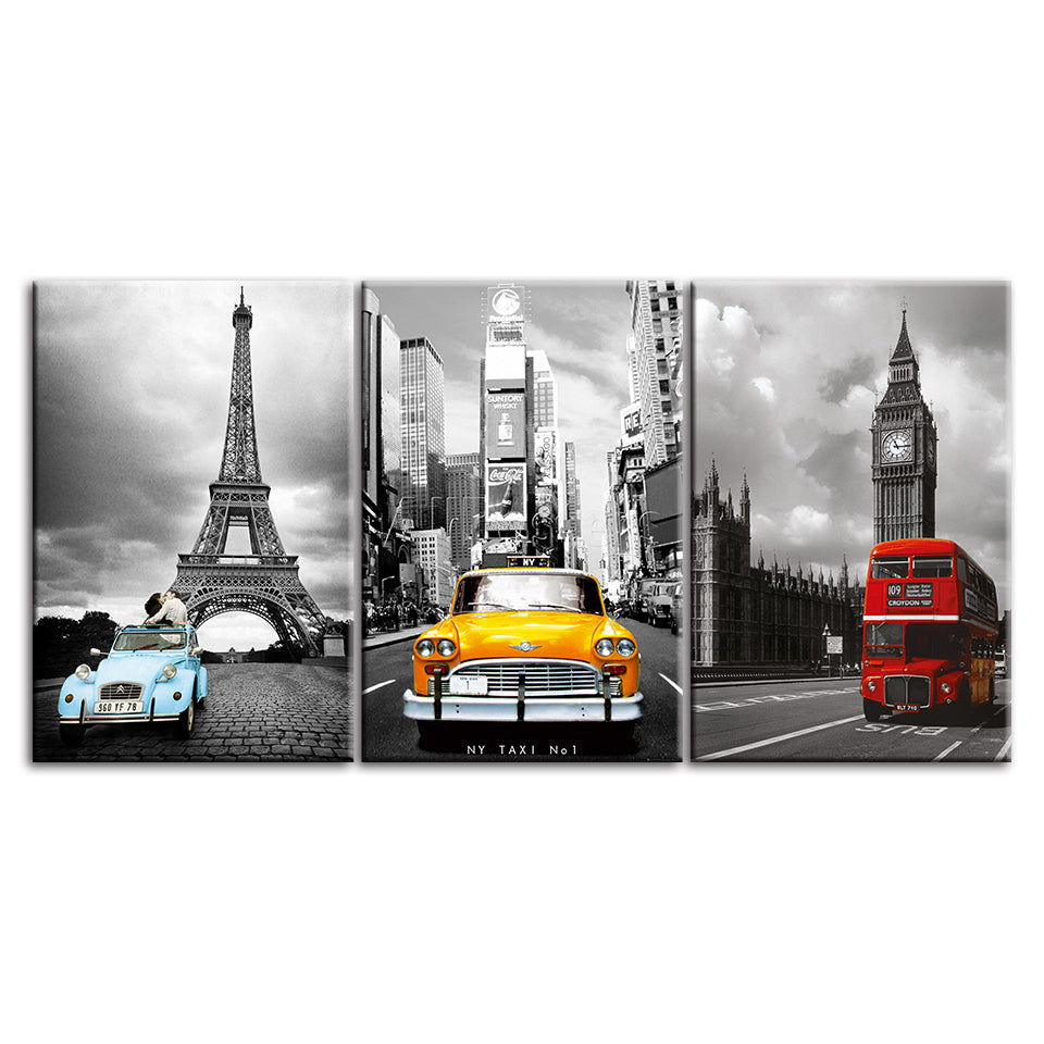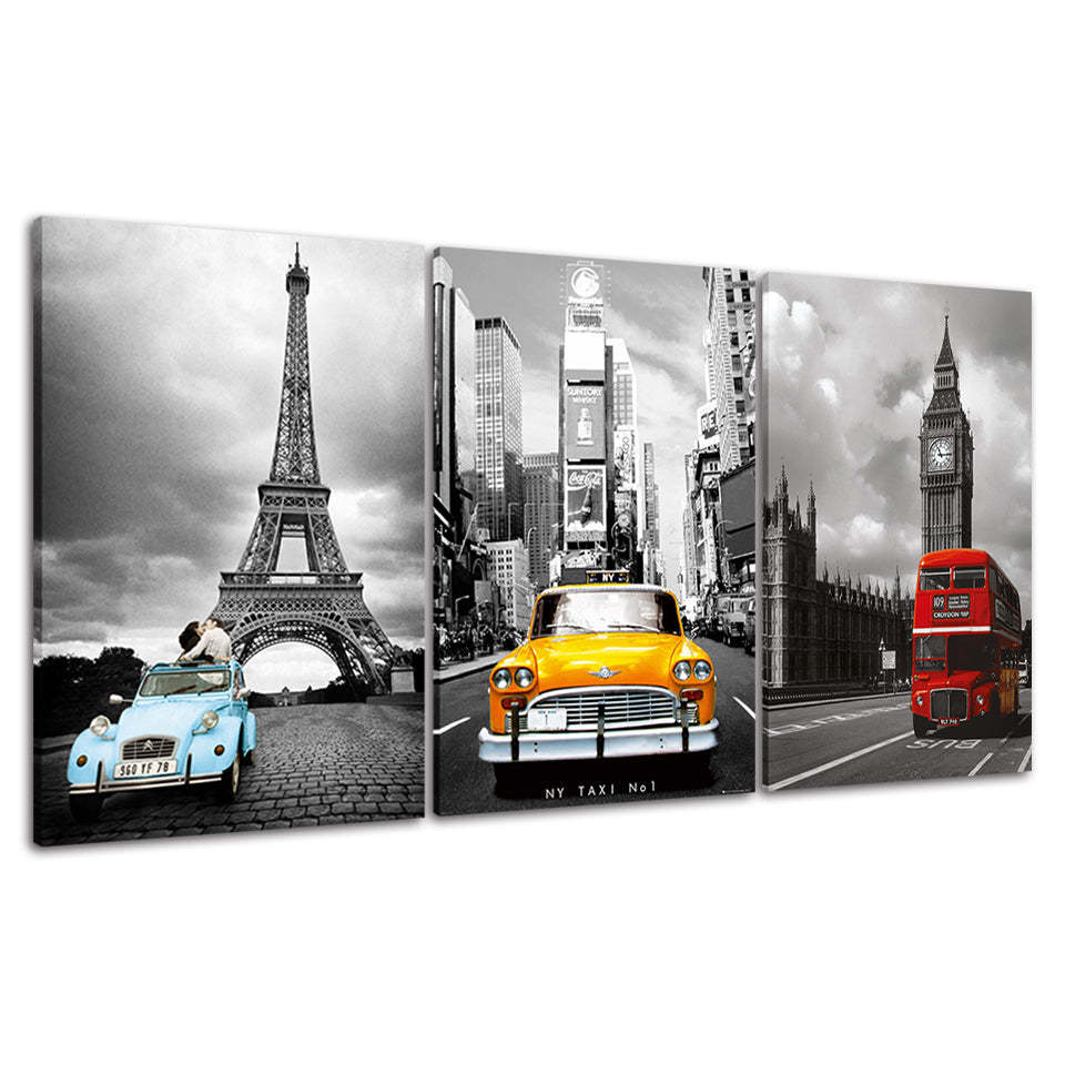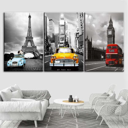 Primary Color Cars 3 Piece - Canvas Wall Art Painting is a premium canvas that adds a colorful touch to your decor. The canvas features a red, yellow, and blue vehicle on each canvas on a black and white background.