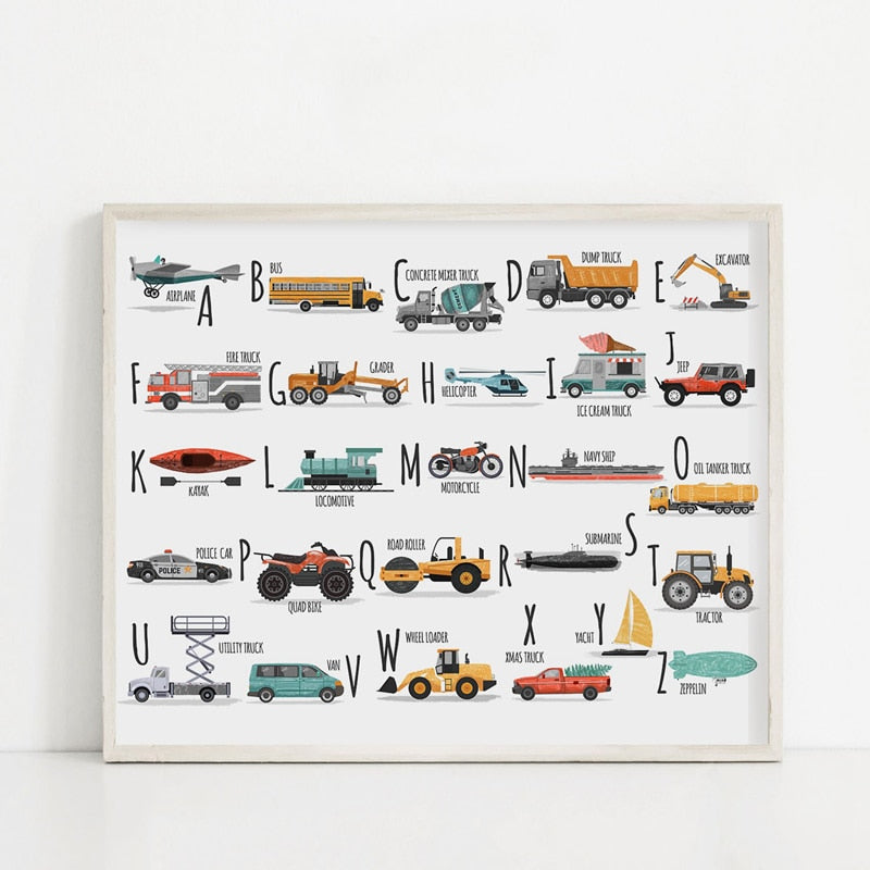 Printed Car Alphabet - Canvas Wall Art Painting is a premium canvas that adds a touch of sportiness to your décor. The canvas features an alphabet of vintage cars! Are you a fan of antiques kept in pristine condition? This mural will provide joyful sensations, presenting the elegant beauty of these vintage vehicles. Perfect for intertwining any room.