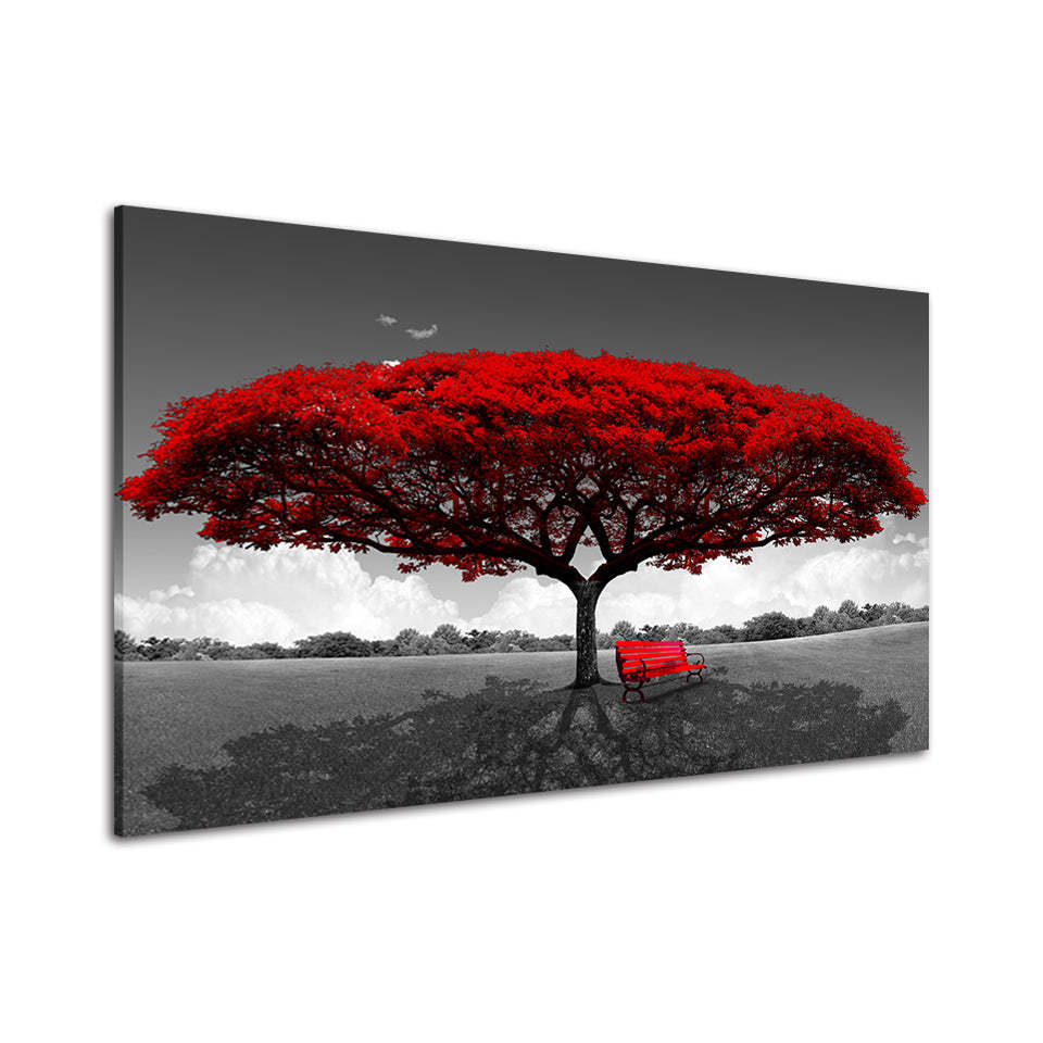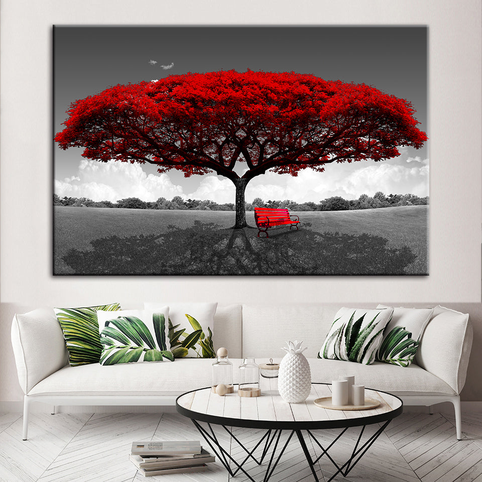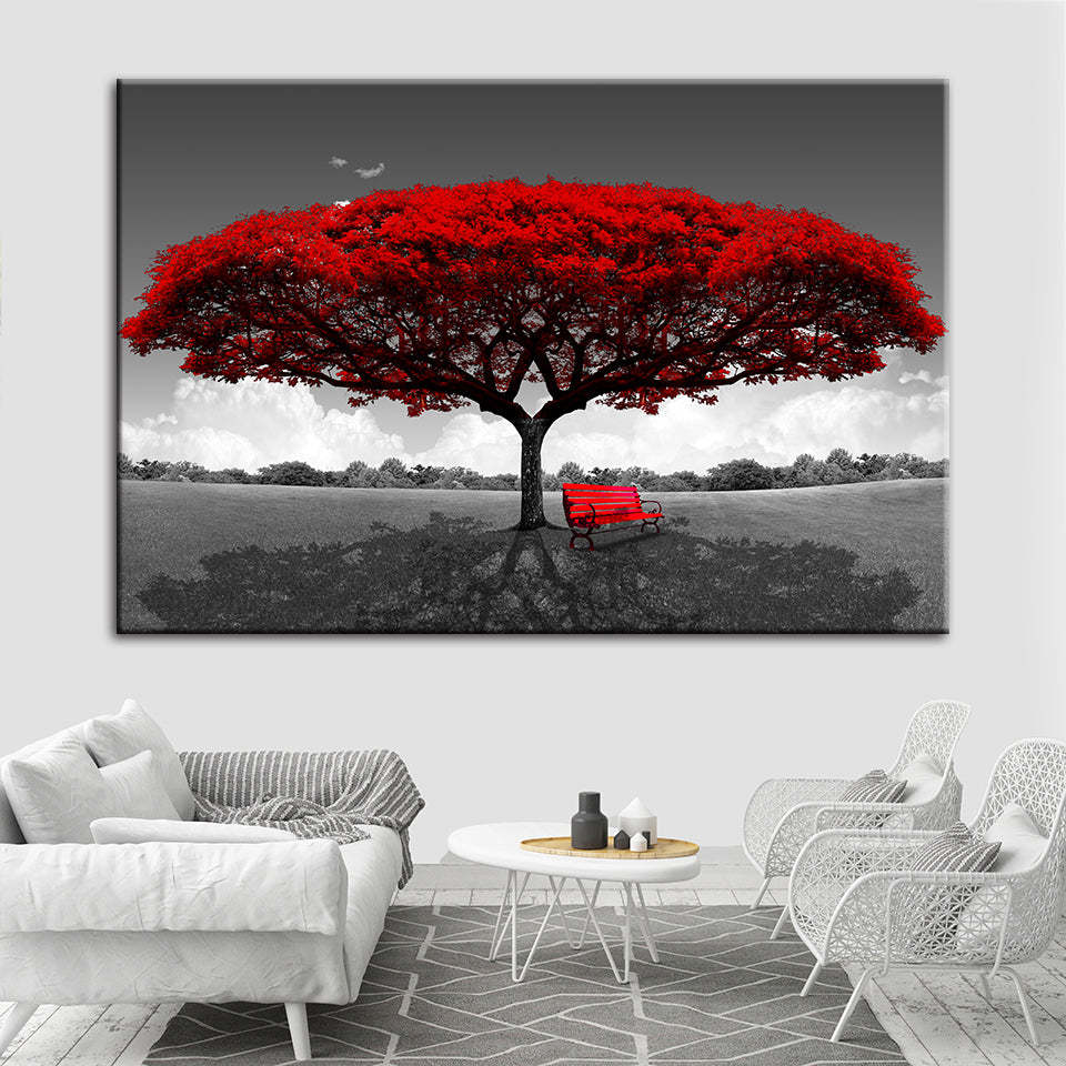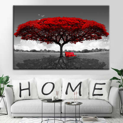 Bring a touch of nature into your home with Red Blossoms - a stunning one-piece canvas wall art featuring a striking red tree against a black and white backdrop.
