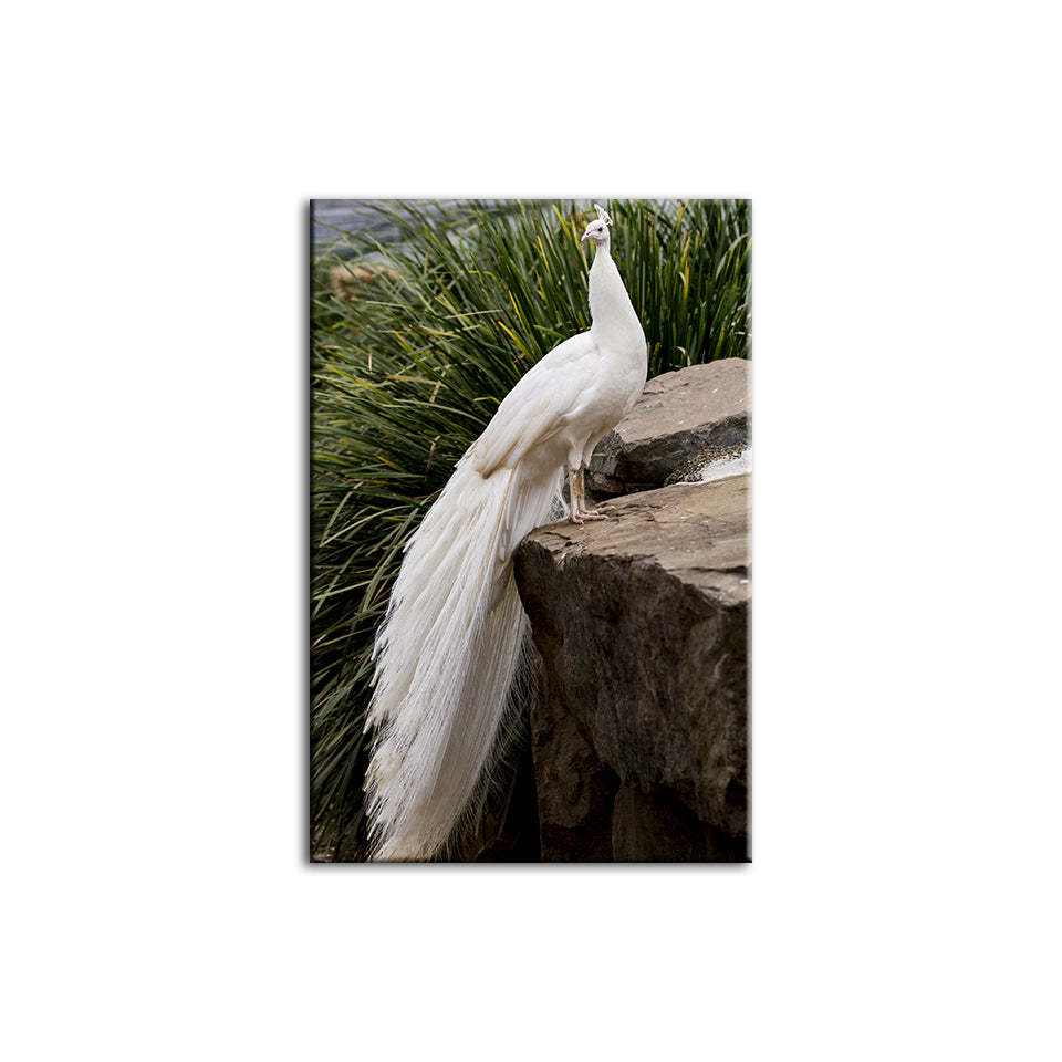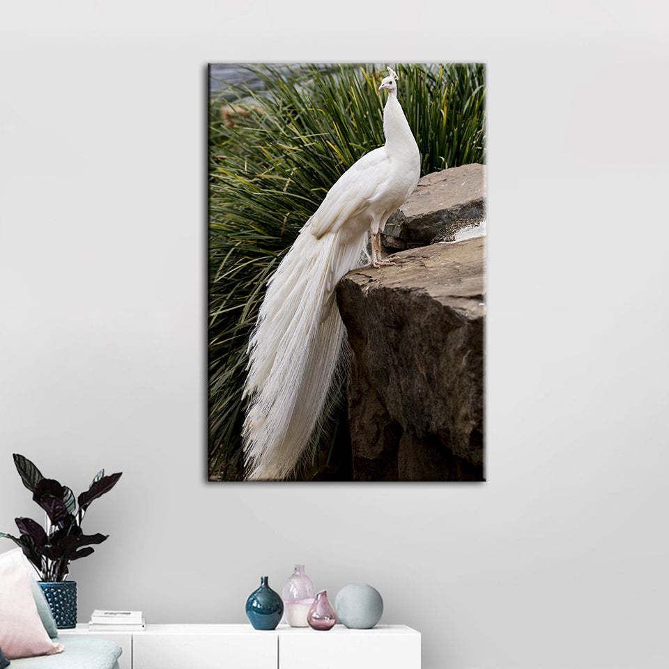 Regal Albino Peacock - Canvas Wall Art Painting is a premium canvas that adds a touch of wildlife art to your décor. The canvas features a snowy white albino peacock standing upon a rock. The Wall Art is perfect to decorate your bedroom, dining room, living room, office, dormitory, hotel lobby, and more! Mix and match your favorite pieces to create an eye-catching feature wall.
