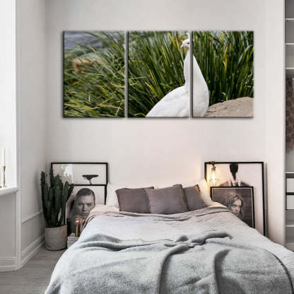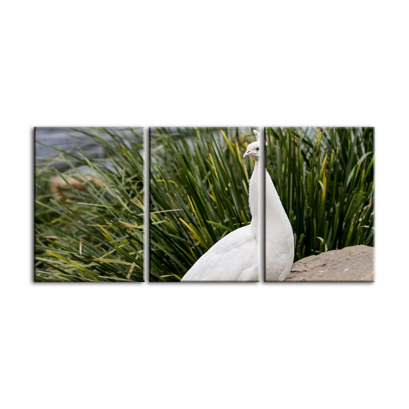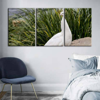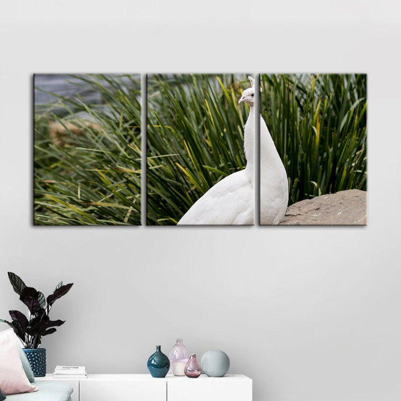 Regal Albino Peacock-Canvas Wall Art Painting 3 Pieces is a premium canvas that adds a peaceful touch to your décor. The canvas features a snowy white albino peacock standing upon a rock.
