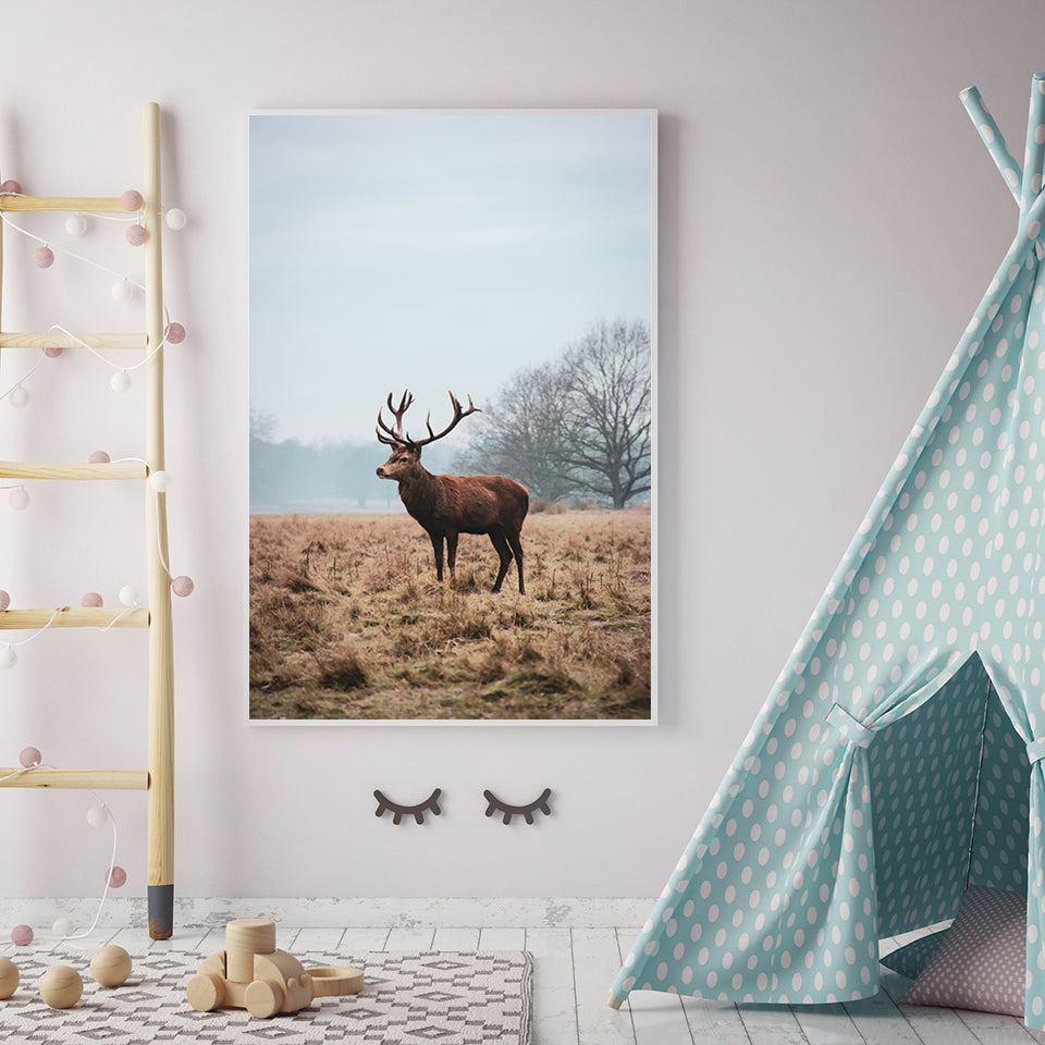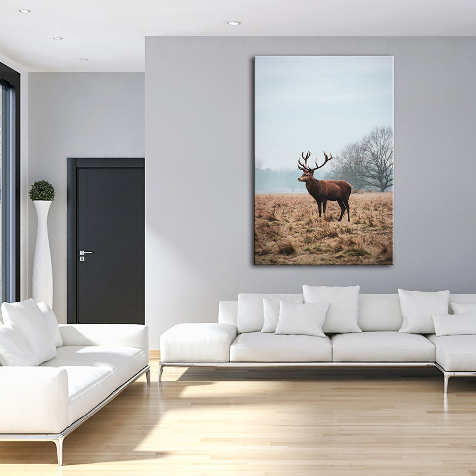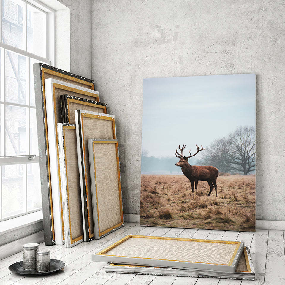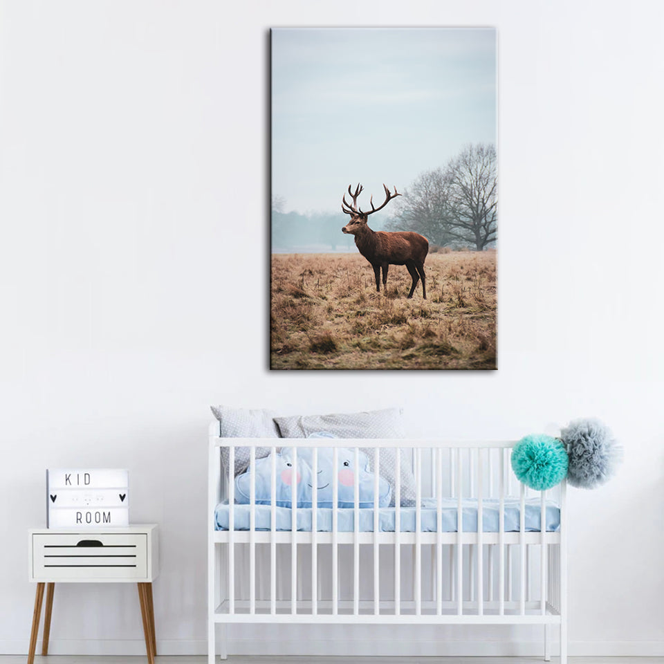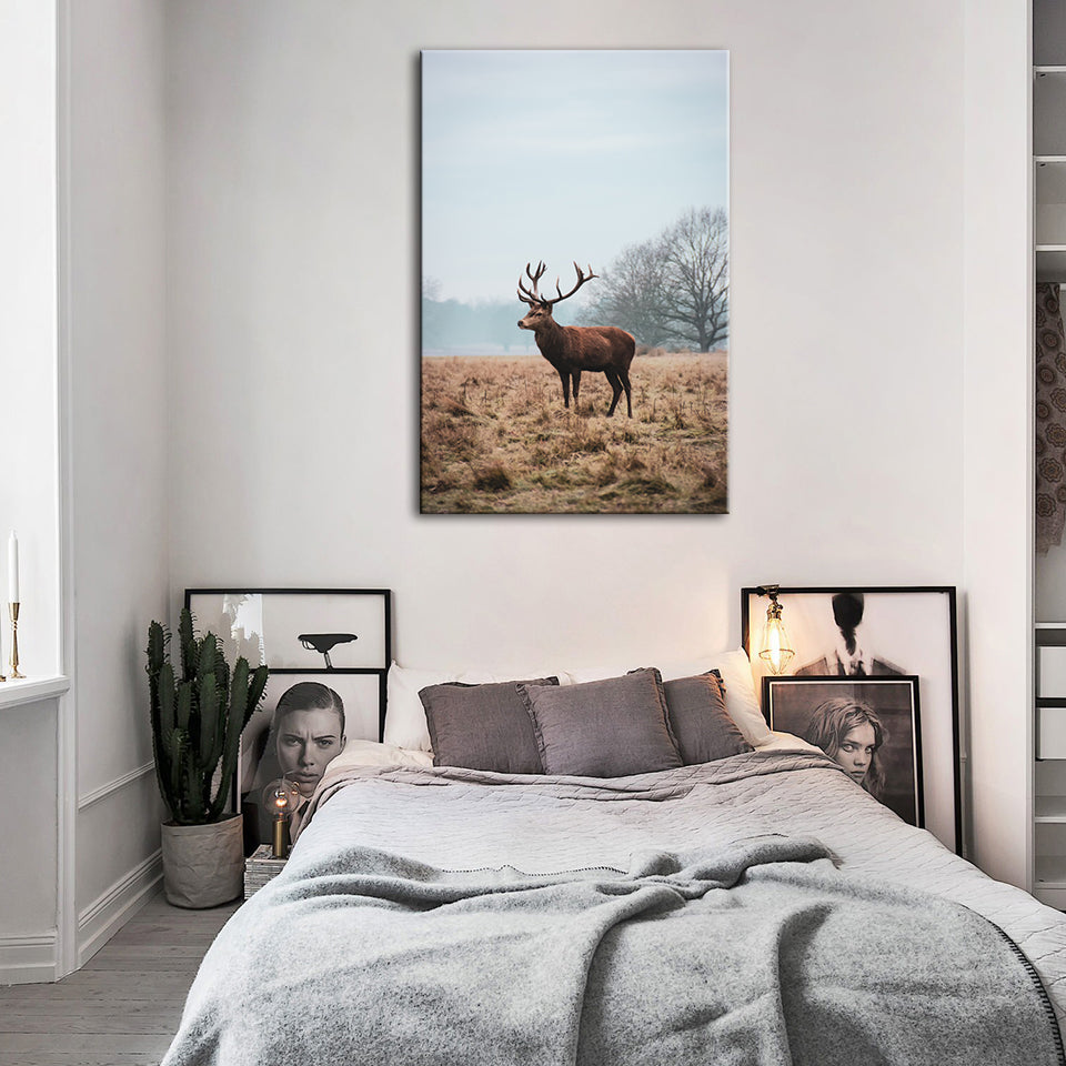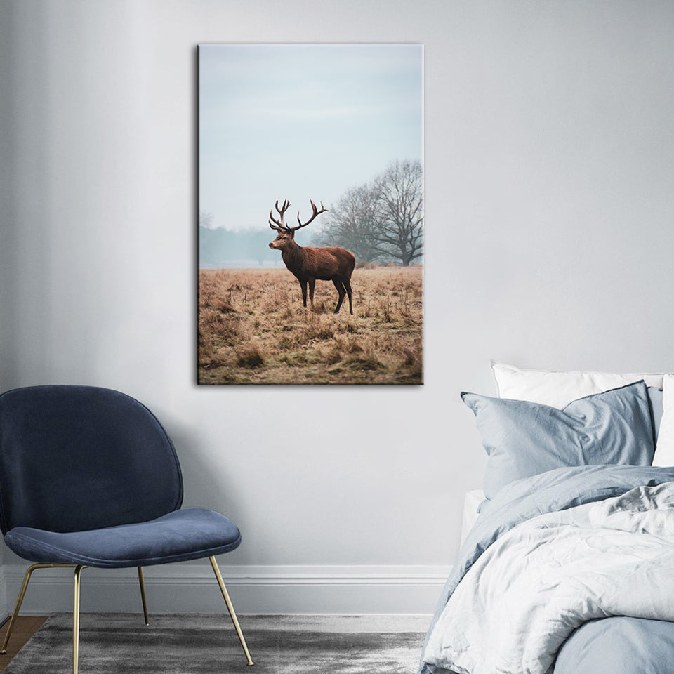 Regal Deer in the Plains - Canvas Wall Art Painting is a premium canvas that adds a thoughtful touch to your décor. The canvas features an majestic deer stood before a pastel blue sky in an open field.