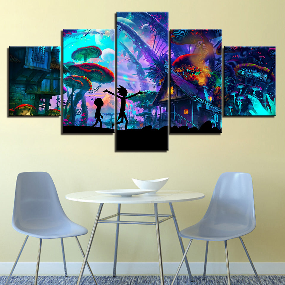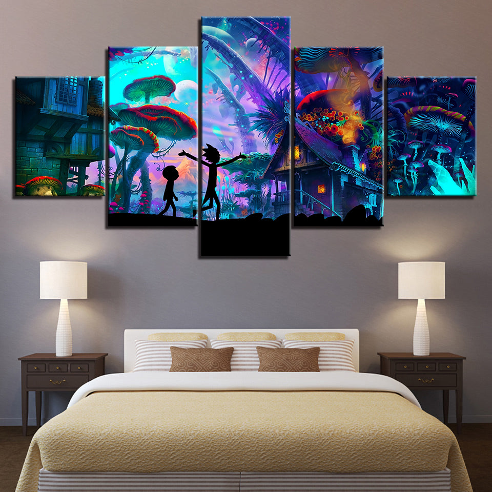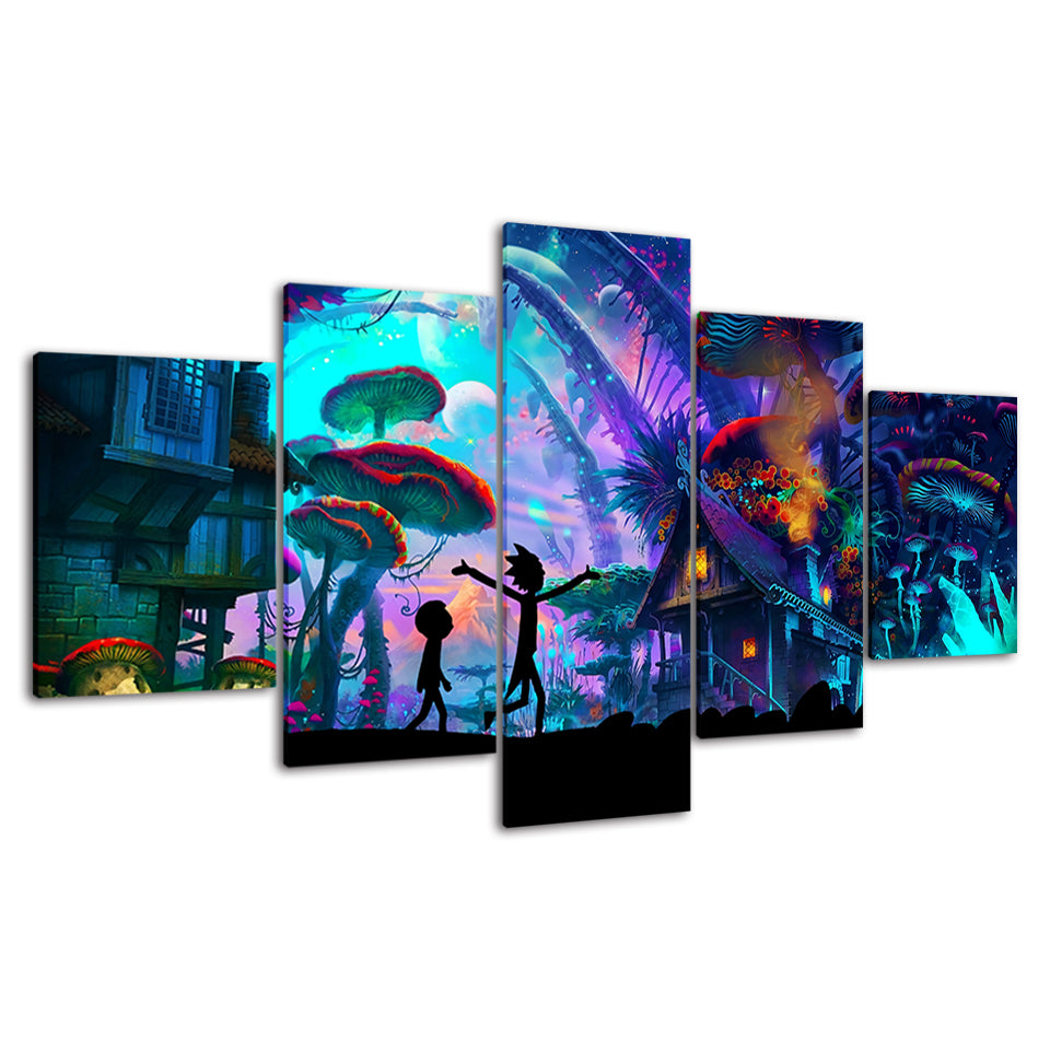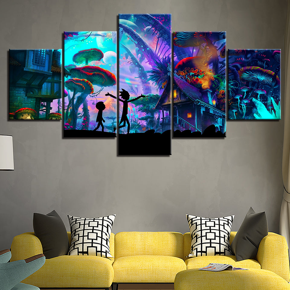 Ricky's Mushroom City - Canvas Wall Art Painting is a premium canvas that adds a touch retro to your décor. The canvas features two characters walking underneath the mushroom city in green and purple hues. This is great to place in a bedroom, living room, or dining room.