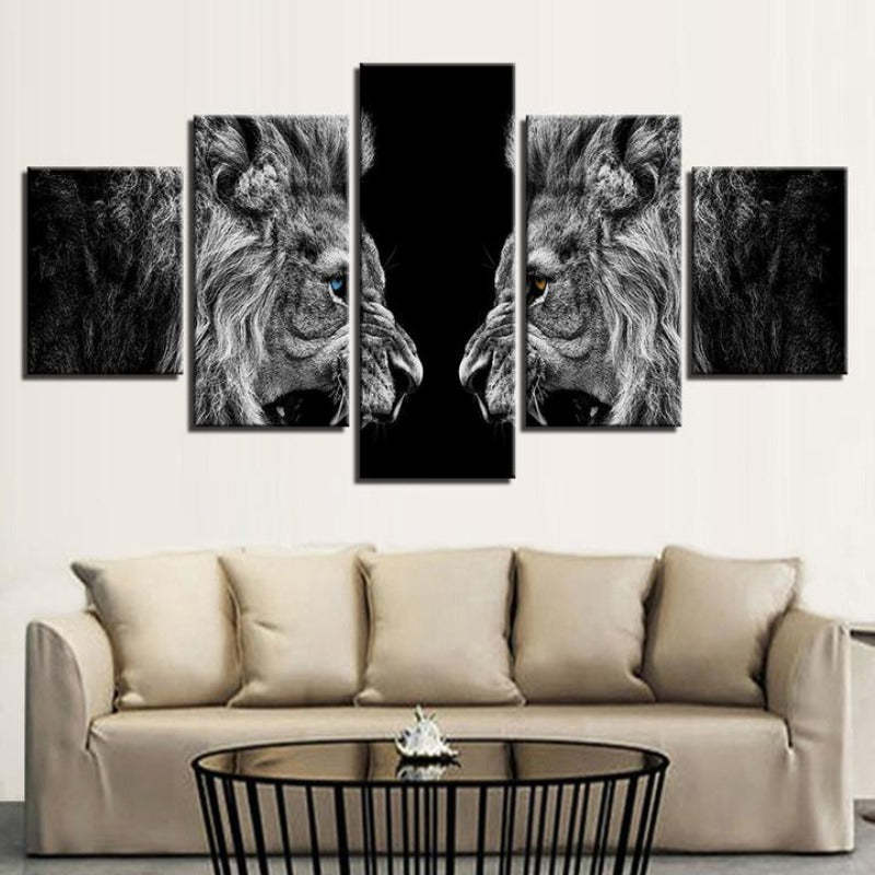 Roaring Lions - Canvas Wall Art Painting is a premium canvas that adds a bold touch to your décor. The canvas features two black and white lion roaring at each other. This amazing piece shows artistic knowledge, using cool shades and tones to encourage any viewer to engage. The stunning ferocious beasts roaring is a sight to behold. The vertical symmetry is a great addition to add the ferocious nature. This piece would fit anywhere in the home.