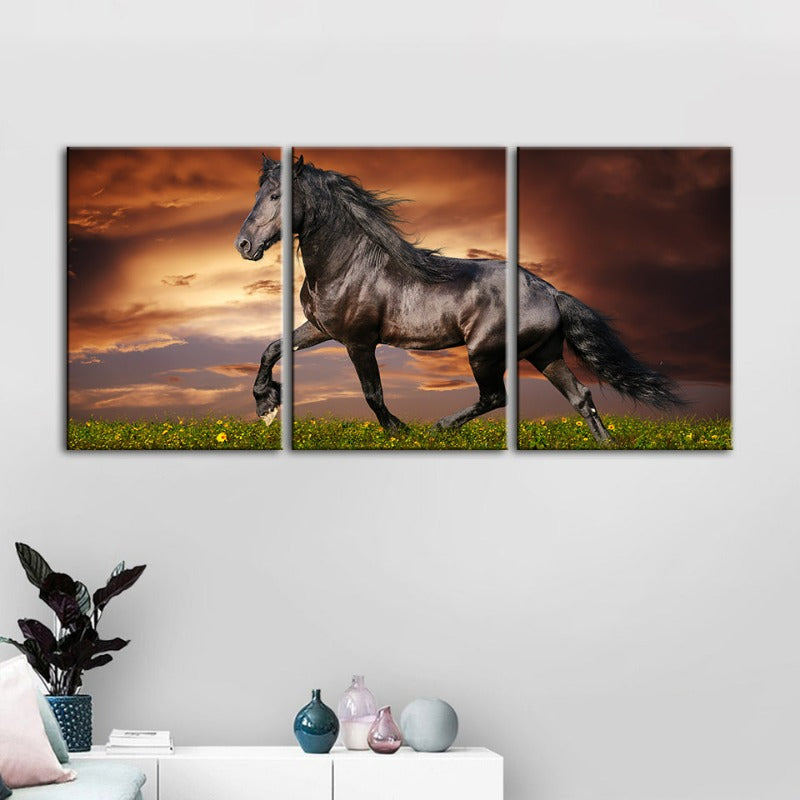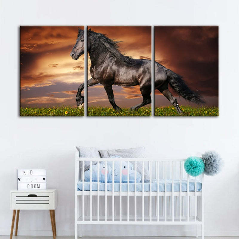 Running Black Horse-Canvas Wall Art Painting 3 Pieces is a premium canvas that adds a touch of architecture art to your décor. The Wall Art is perfect to decorate your bedroom, dining room, living room, office, dormitory, hotel lobby, and more! Mix and match your favorite pieces to create an eye-catching feature wall.