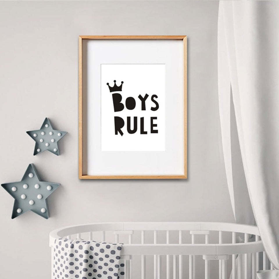 Scandinavian Boys Rule Crown Nursery Decor - Canvas Wall Art Painting is a quotes poster with the spray painting technique in a vertical rectangle shape made from canvas material suitable for every living space for Decor, It is available in a variety of designs and abstract shapes making it ideal for gifting in every occasion.