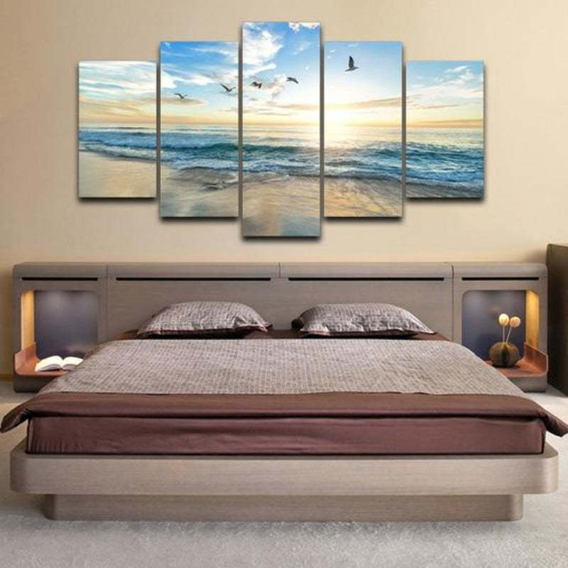 Seagulls on Beach - Canvas Wall Art Painting is a premium canvas that adds a touch of summer fresh beach to your décor. The canvas features a beach setting with soft waves, a bright sky, and seagulls flying.