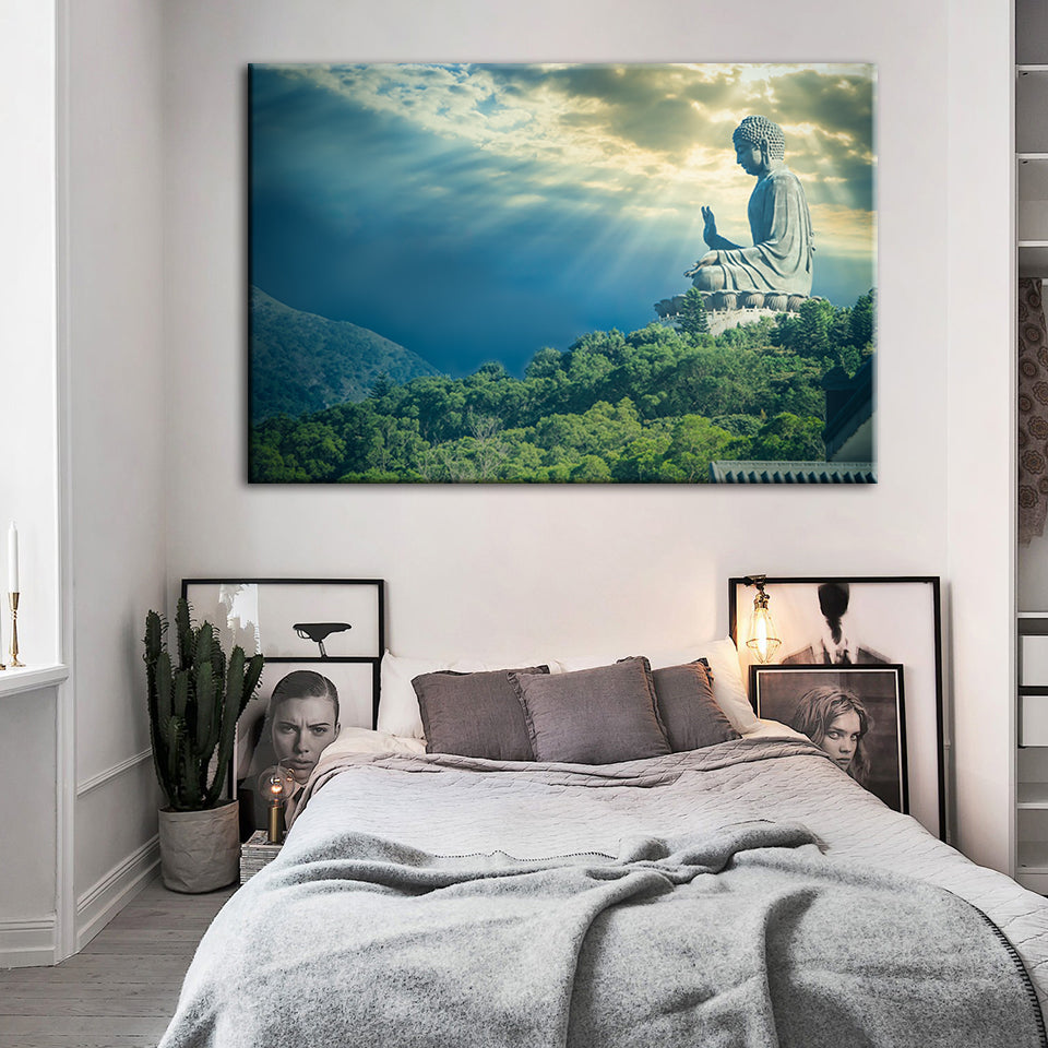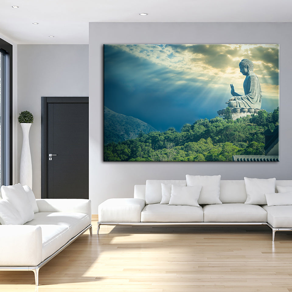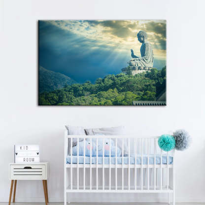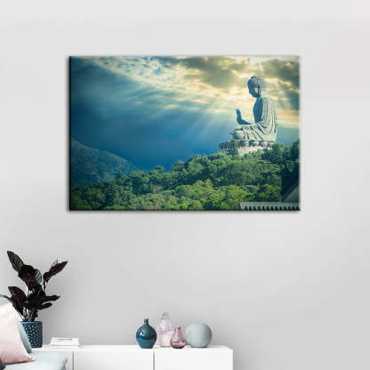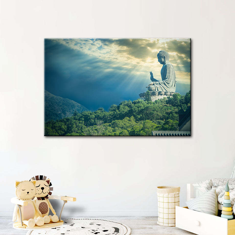 Secret Sky - Canvas Wall Art Painting is a premium canvas that adds a calming touch to your decor. The canvas features a statue sitting high on a hill with the sun shining down from above.