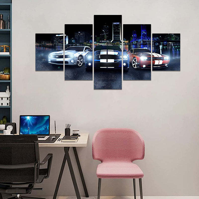 Set Of 5 American Muscle Wall Art Painting has an elegant print of your favorite race cars. This wall canvas is perfect for your living room, bedroom, kitchen, and any other space you like. The hook on the back of the canvas makes it ready to hang. The artistic colors do not fade easily.
