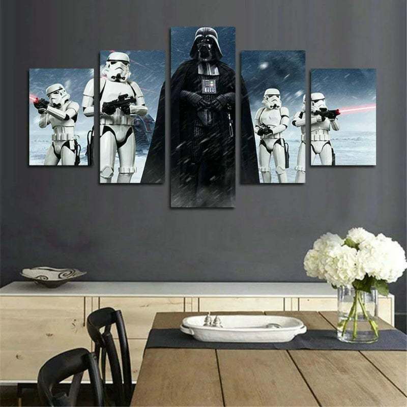 Set of 5 Death Vader Wall Canvas has a deadly look that will have a great impact on your space. The canvas has high-definition art work which makes it a great gift for your friends and relatives. You can hang it in your living room, bedroom, kitchen, or wherever you want.