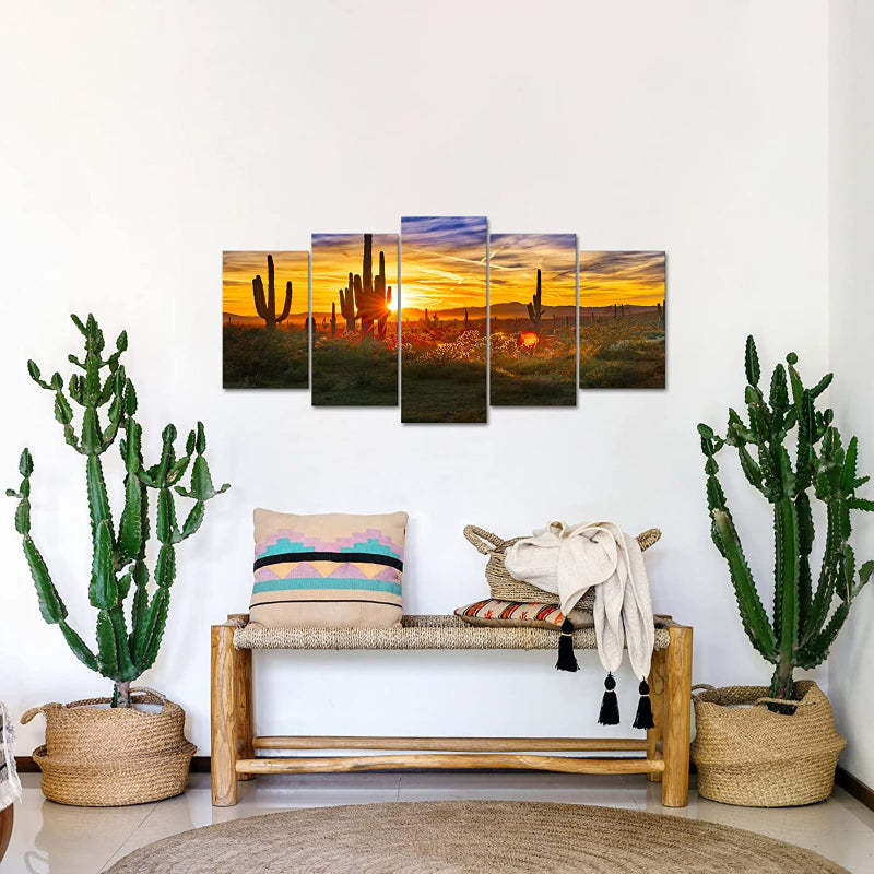 With our Set Of 5 Desert Sunset Wall Art Painting Collection, you can get a better-looking, extremely flexible canvas with a flawless finish. But what distinguishes this product from others is the surface embellishment of silver foil and the superior micro-printing ink that not only improves the design but also aids in preventing color fading. This a fantastic gift idea for yourself and your loved ones.