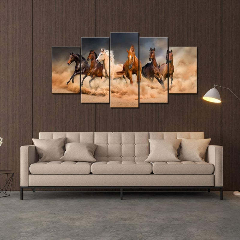 This high-definition artwork Set Of 5 Running Horse Wall Art Painting looks more stylish and levels up the image of your home even higher. The energetic horse picture hanging wall art spreads a spirit of good vibes and is best for gifting your loved ones. Its size is measured perfectly and carries a unique finish.
