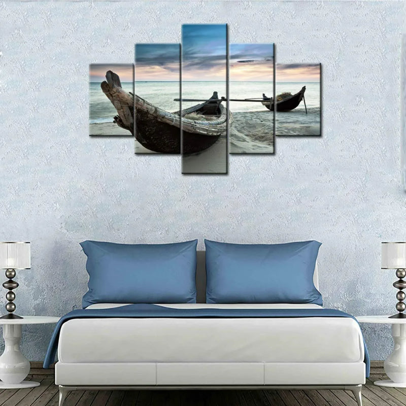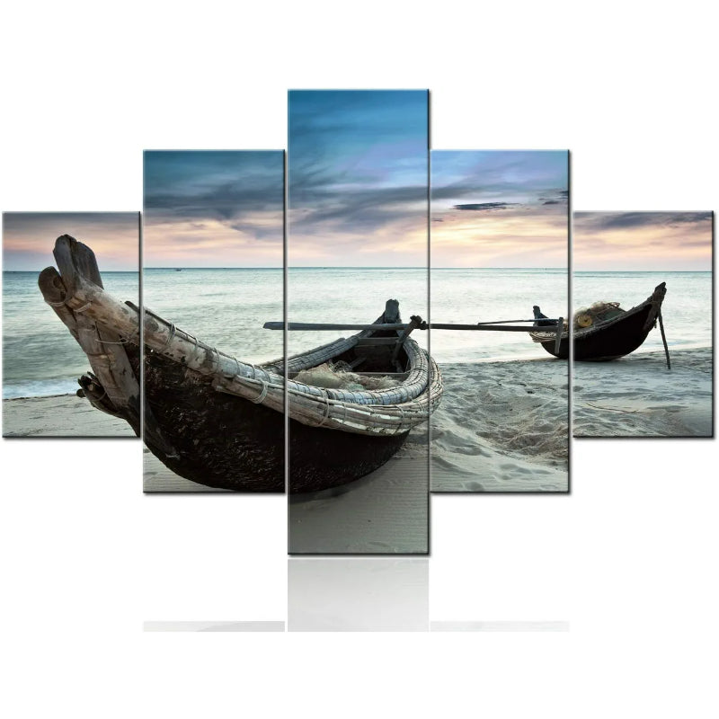 Experience the beauty of the sea with our Set Of 5 Two Fisherman Boats Decorative Canvas. Give your home or office a touch of coastal charm with this hand-crafted canvas art. The vivid colors, intricate details, and expert craftsmanship will impress any onlooker. Get these charming canvas pieces today and bring some maritime appeal to your walls!