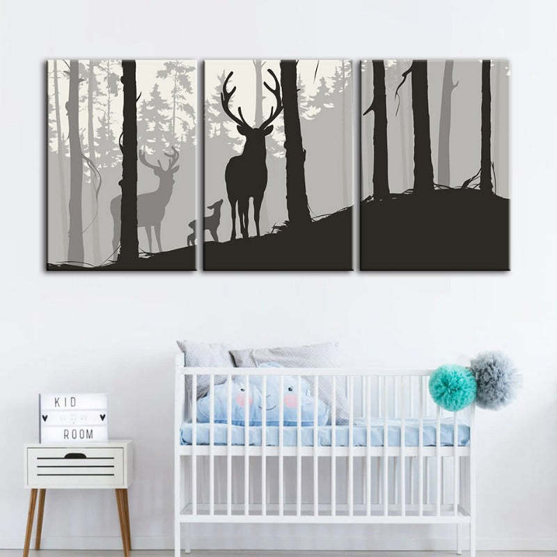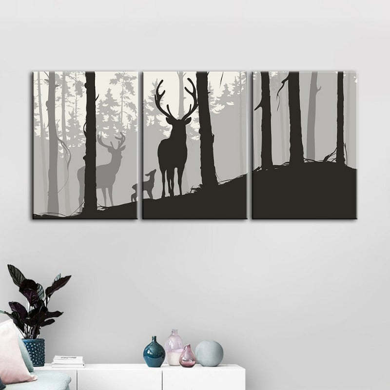 Silhouette Deer Family-Canvas Wall Art Painting 3 Pieces is a premium canvas that adds a peaceful touch to your décor. The canvas features a mystical grayscale scene of an encounter with a family of deer in the woods.