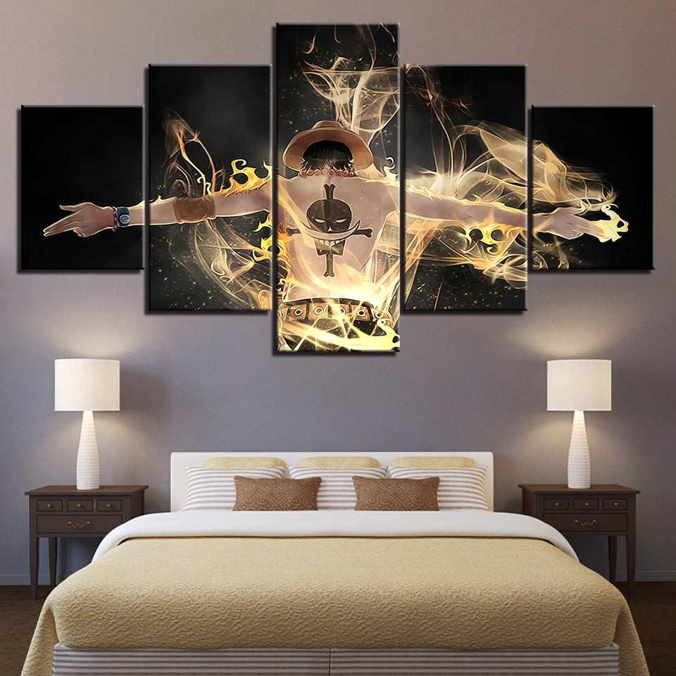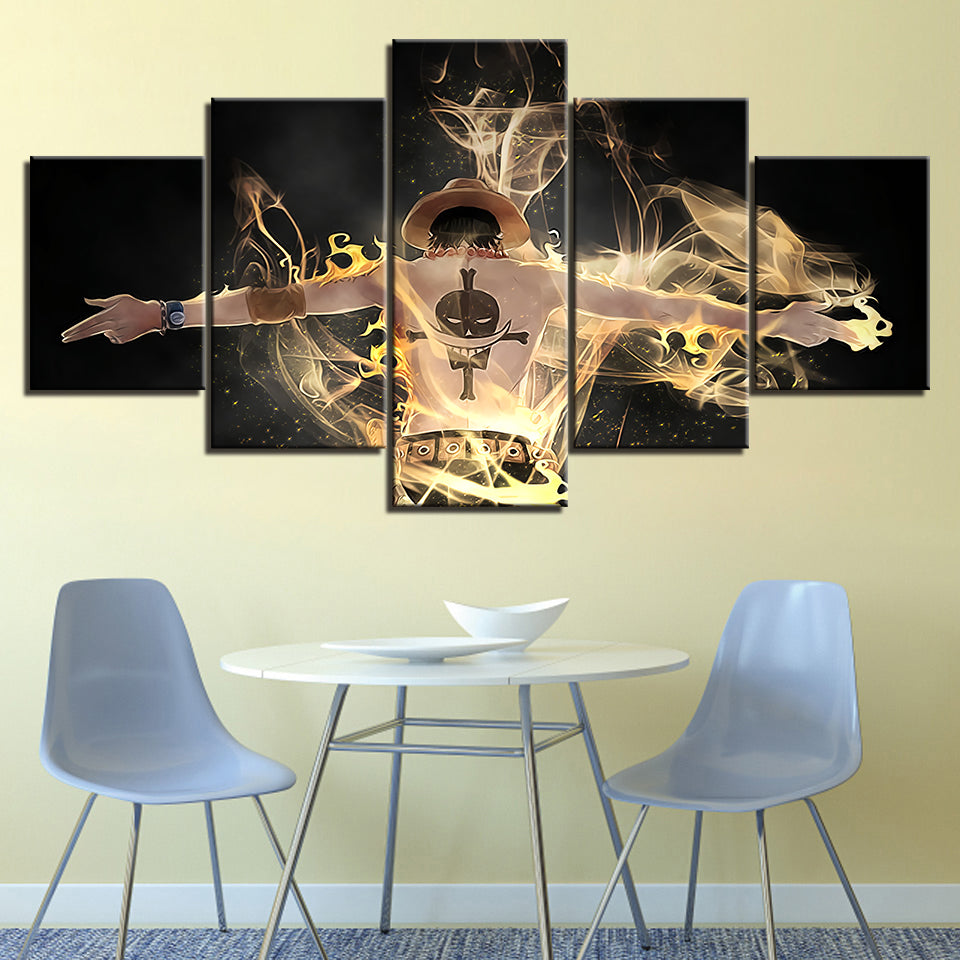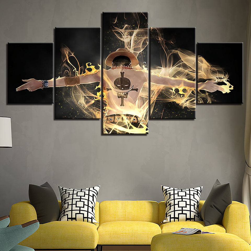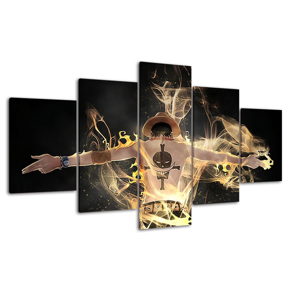 Skullman Fire 5 Piece - Canvas Wall Art Painting is a premium canvas that adds a touch of power to your décor. The canvas features an anime standing with a skull tattoo on his back with fiery flames blazing from his hands.