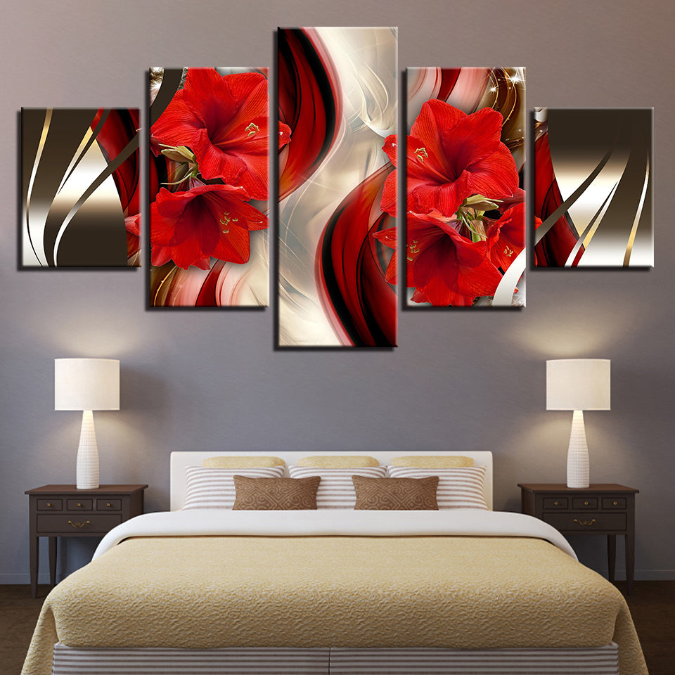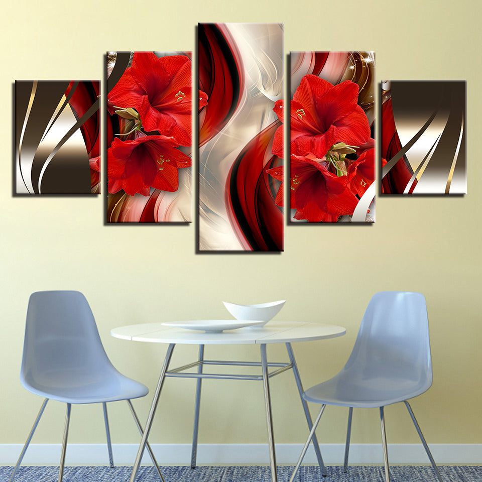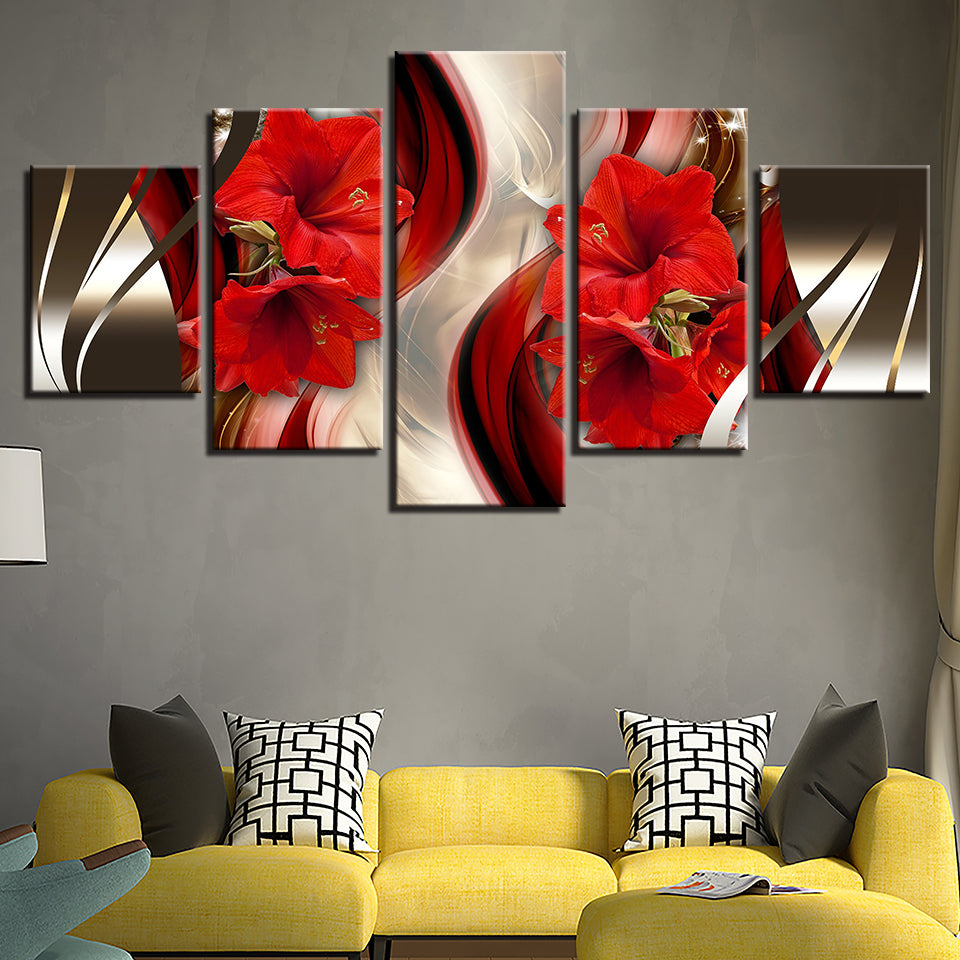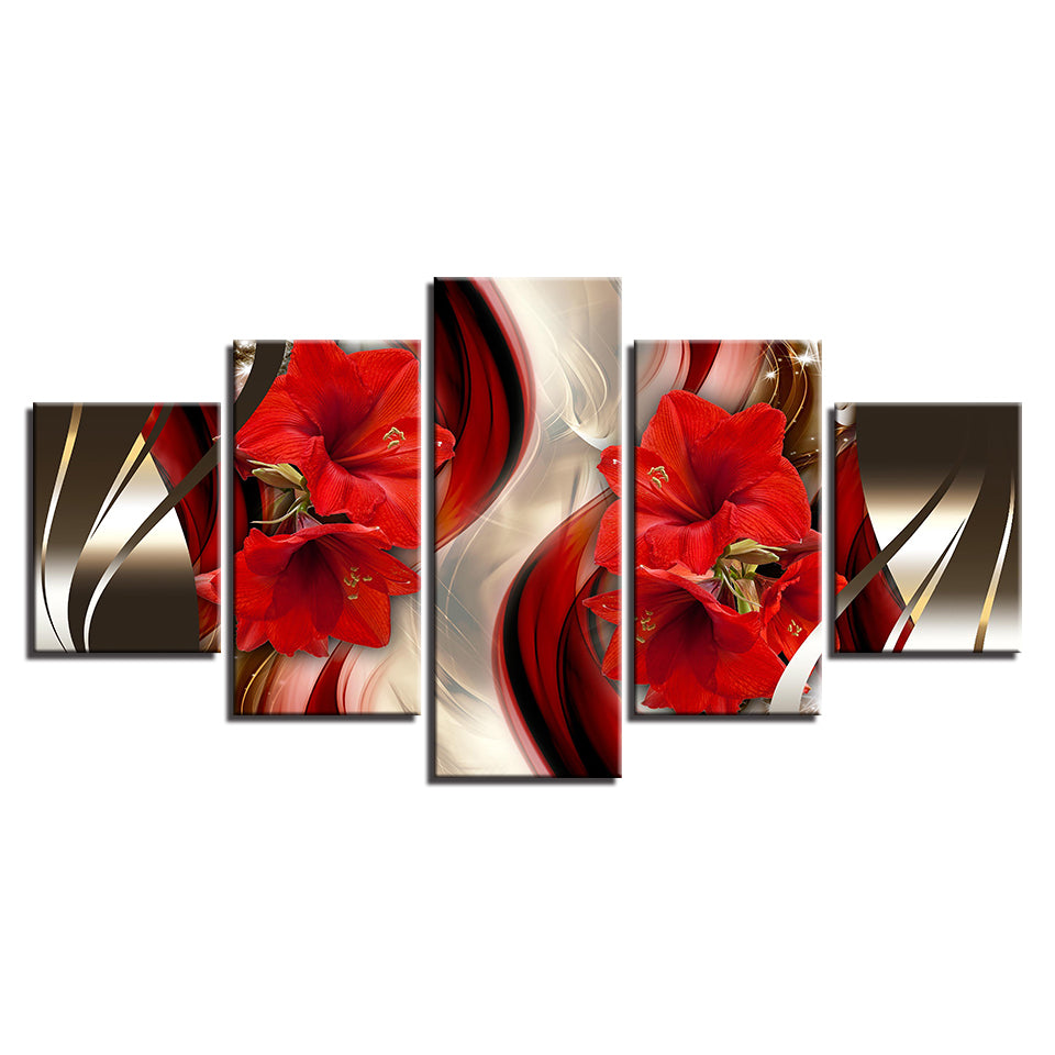 Stunning Red Amaryllis 5 Piece - Canvas Wall Art Painting is a premium canvas that adds a peaceful touch to your décor. The canvas features a classy wavy brown and gold backdrop with brilliant red Amaryllis flowers.