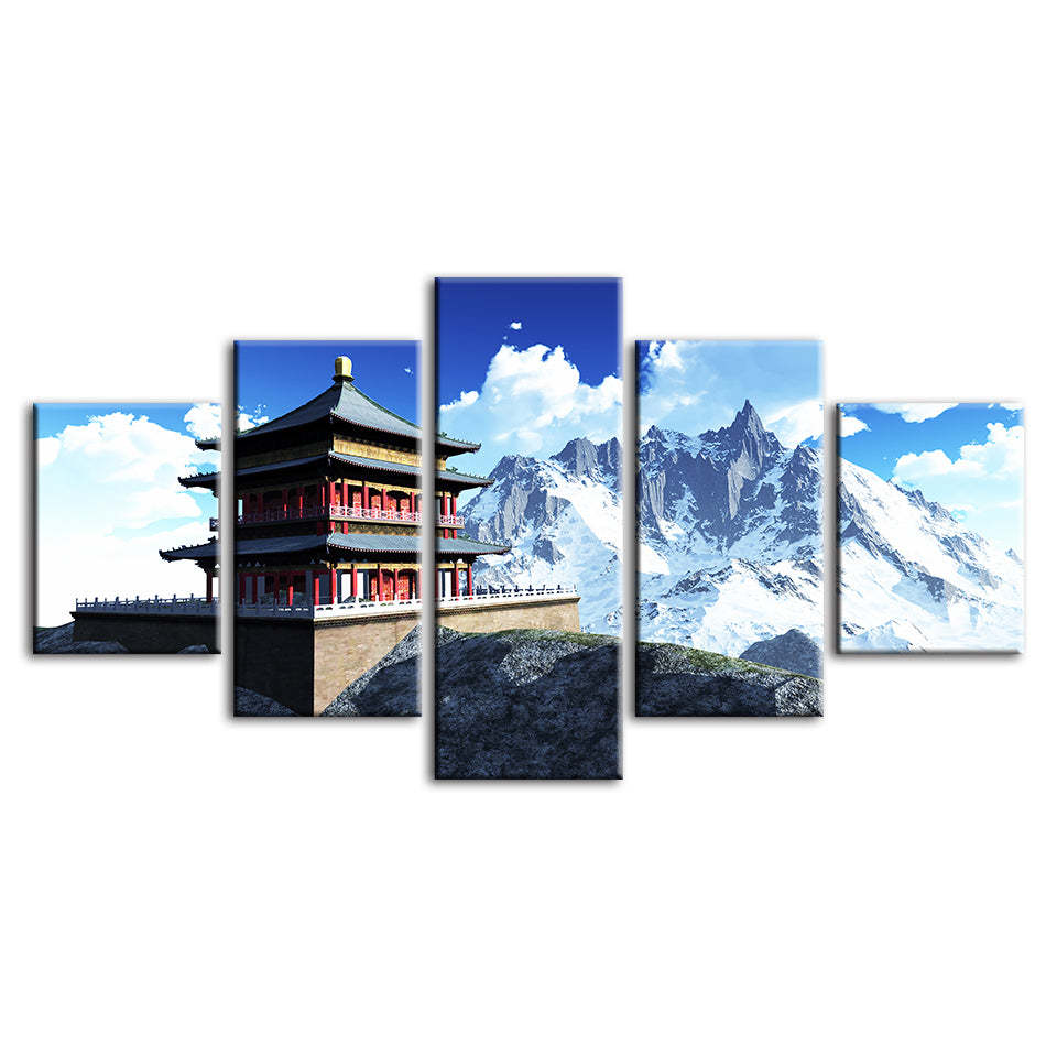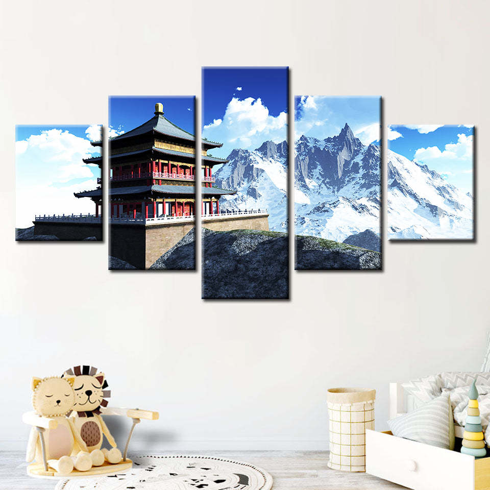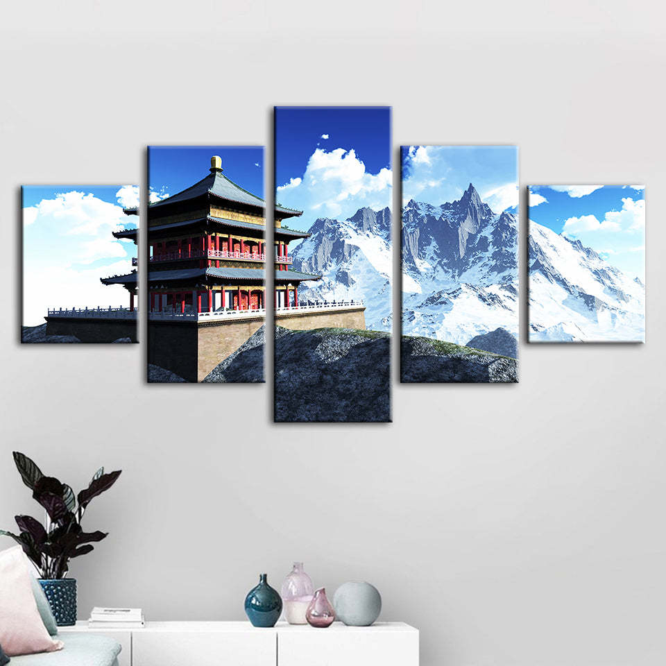 Temple In The Mountains 5 Piece - Canvas Wall Art Painting is a premium canvas that adds a fresh touch to your decor. The canvas features a temple sitting atop a platform with sharp snowy mountains in the back.