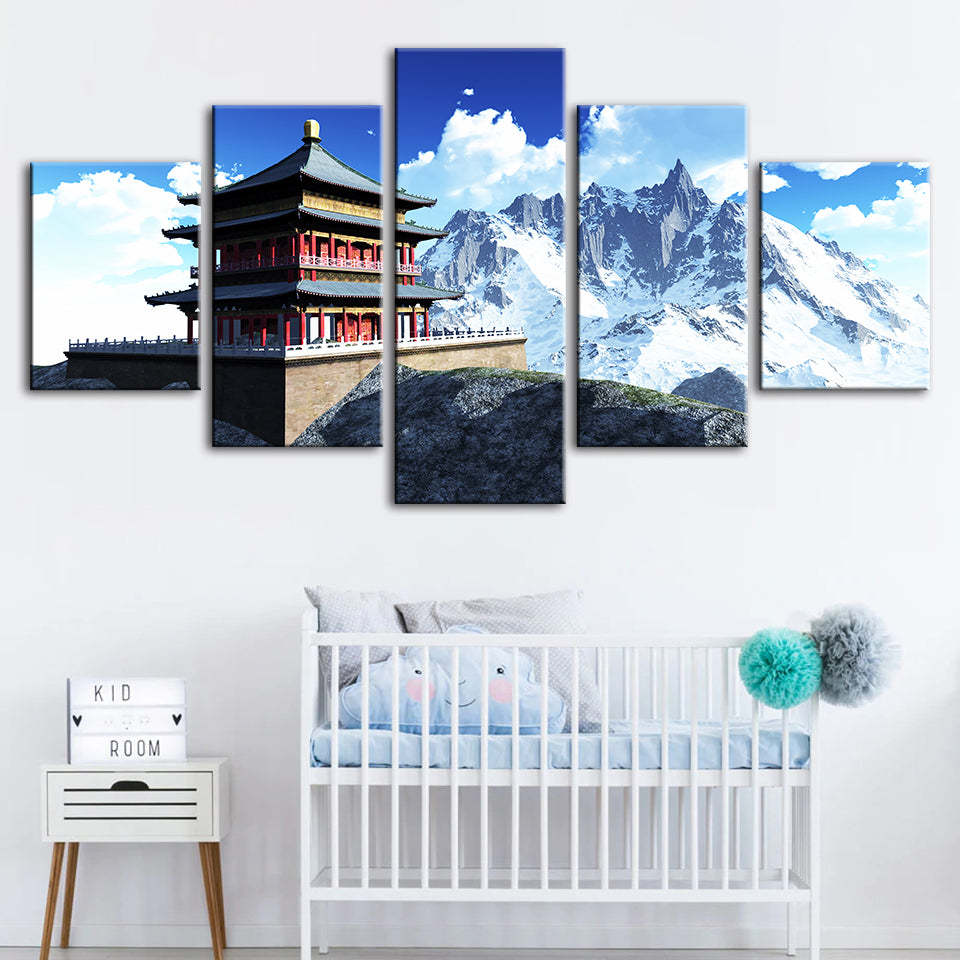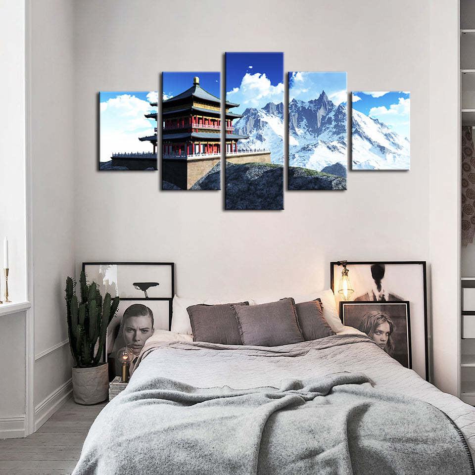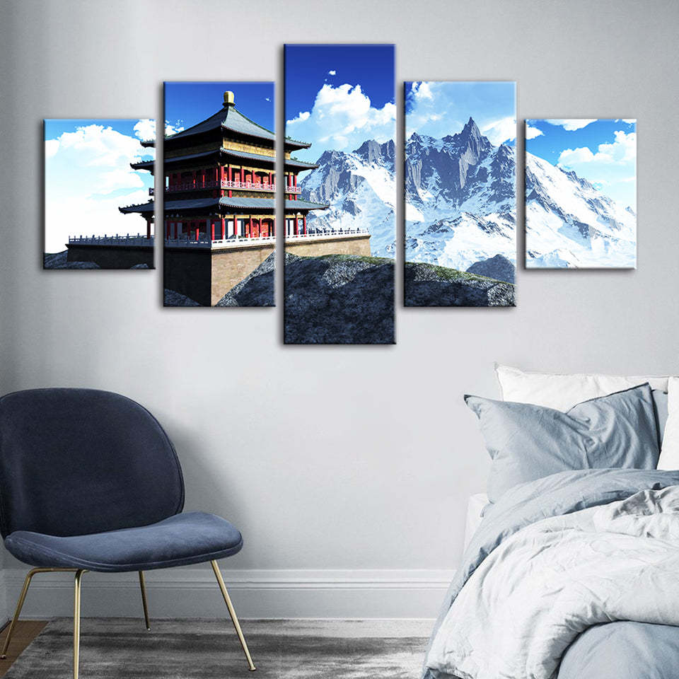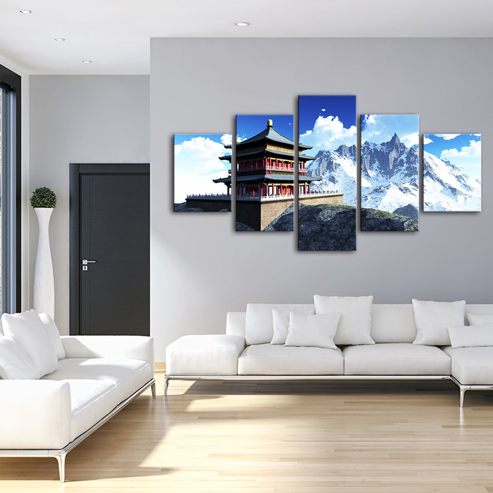 Temple In The Mountains 5 Piece - Canvas Wall Art Painting is a premium canvas that adds a fresh touch to your decor. The canvas features a temple sitting atop a platform with sharp snowy mountains in the back.
