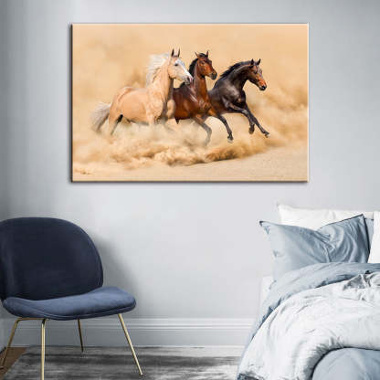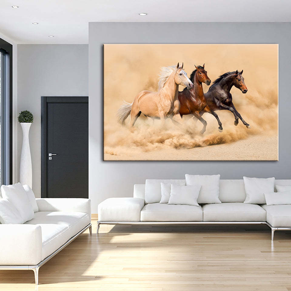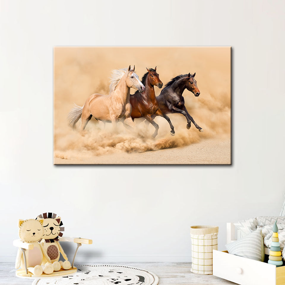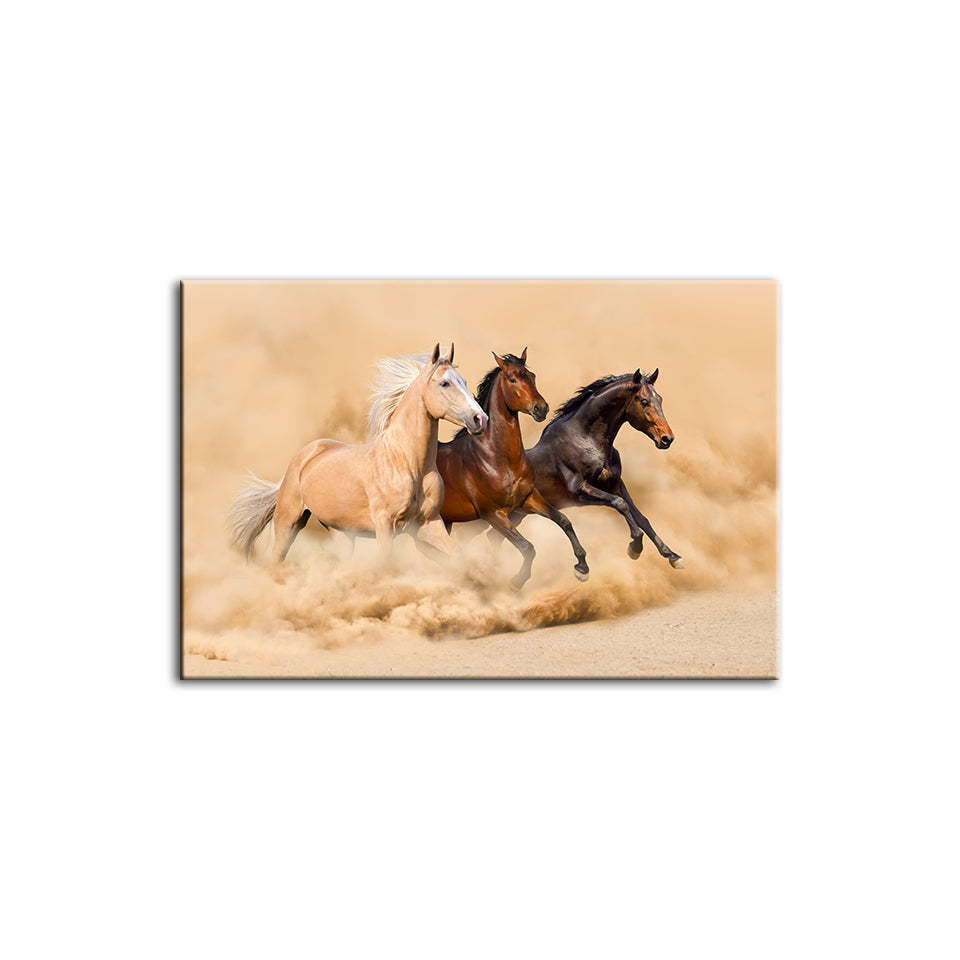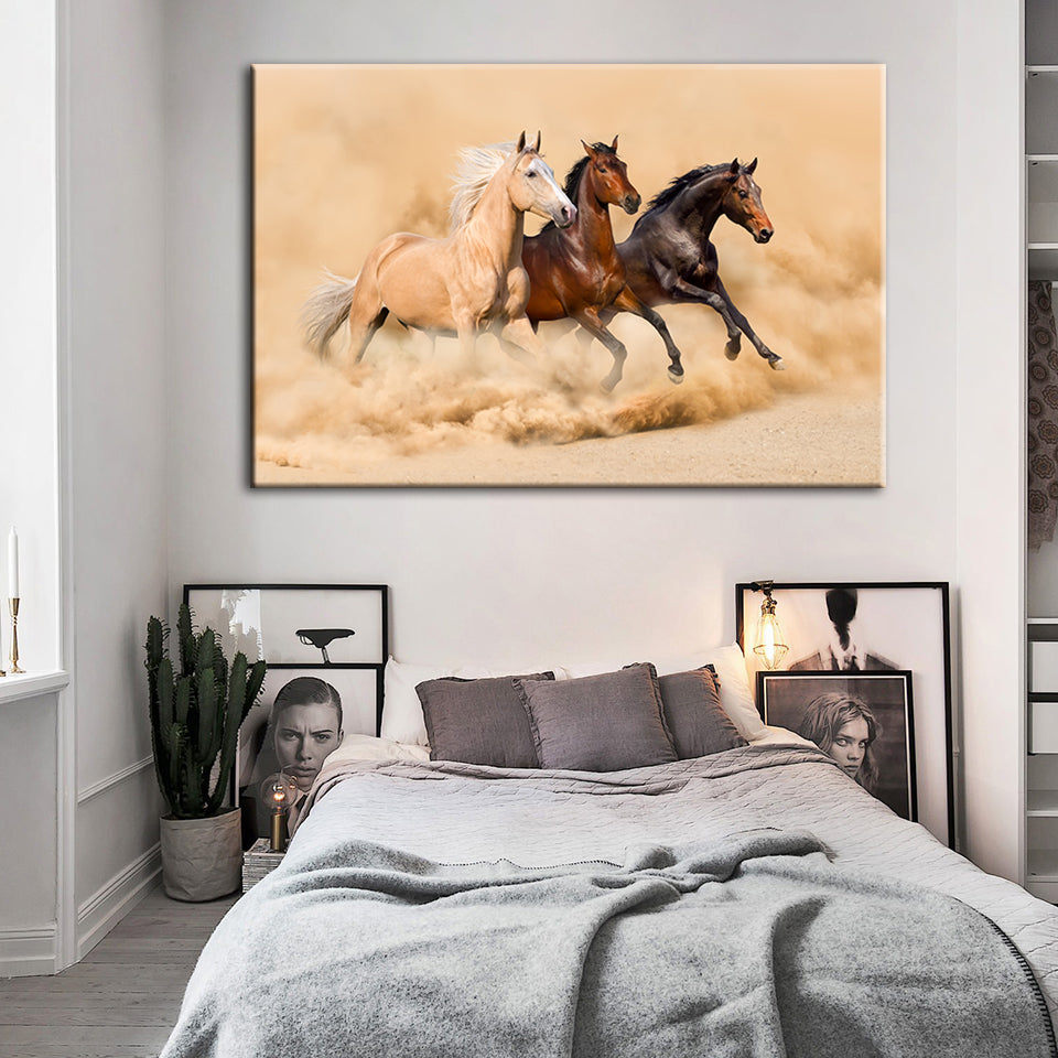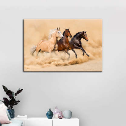Three Running Horses in Desert is a premium canvas that adds a touch of nature to your décor. The canvas features waves with the scenery in the back. The Wall Art is perfect to decorate your bedroom, dining room, living room, office, dormitory, hotel lobby, and more! Mix and match your favorite pieces to create an eye-catching feature wall.