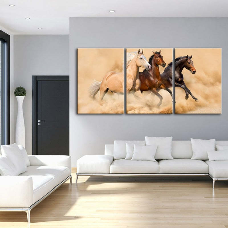 Three Running Horses In Desert-Canvas Wall Art Painting 3 Pieces is a premium canvas that adds a touch of architecture art to your décor. The Wall Art is perfect to decorate your bedroom, dining room, living room, office, dormitory, hotel lobby, and more! Mix and match your favorite pieces to create an eye-catching feature wall.
