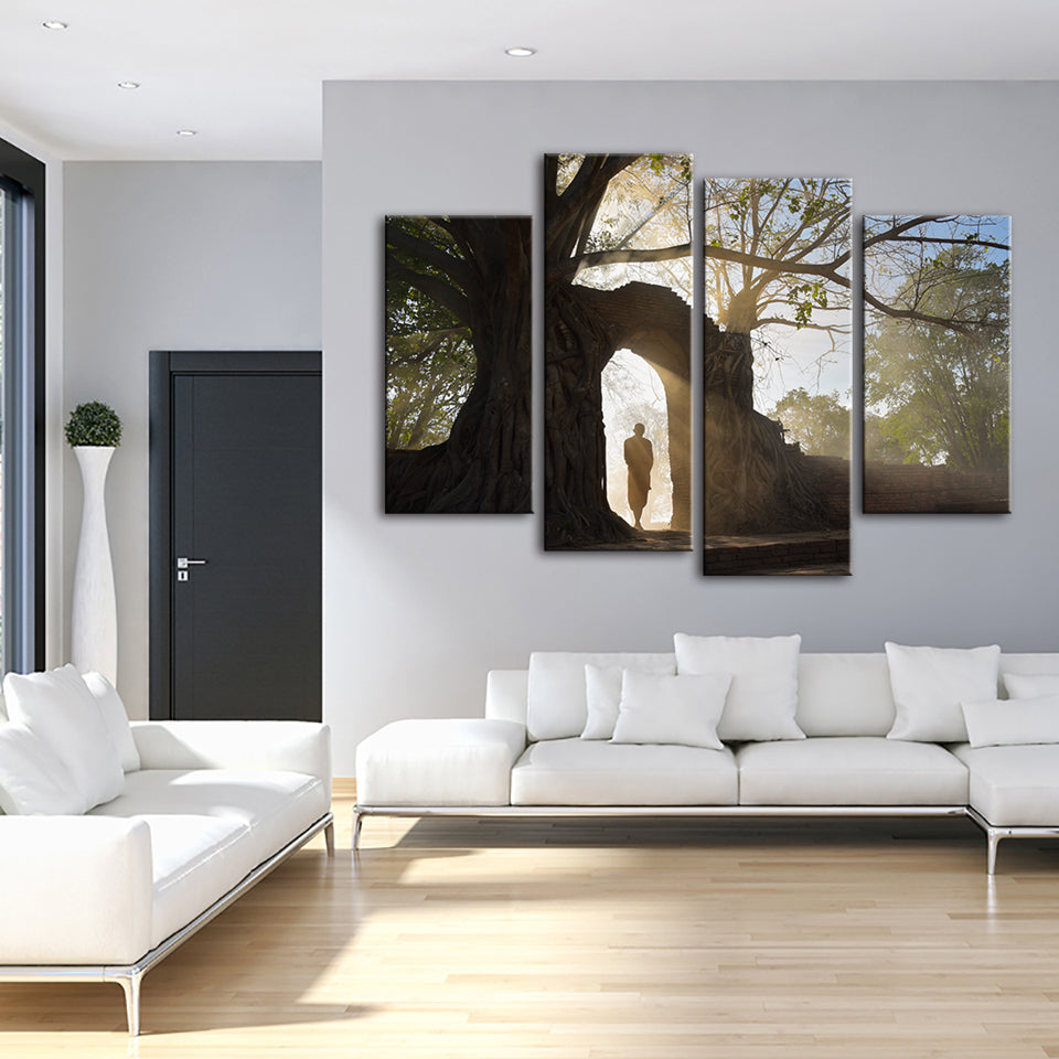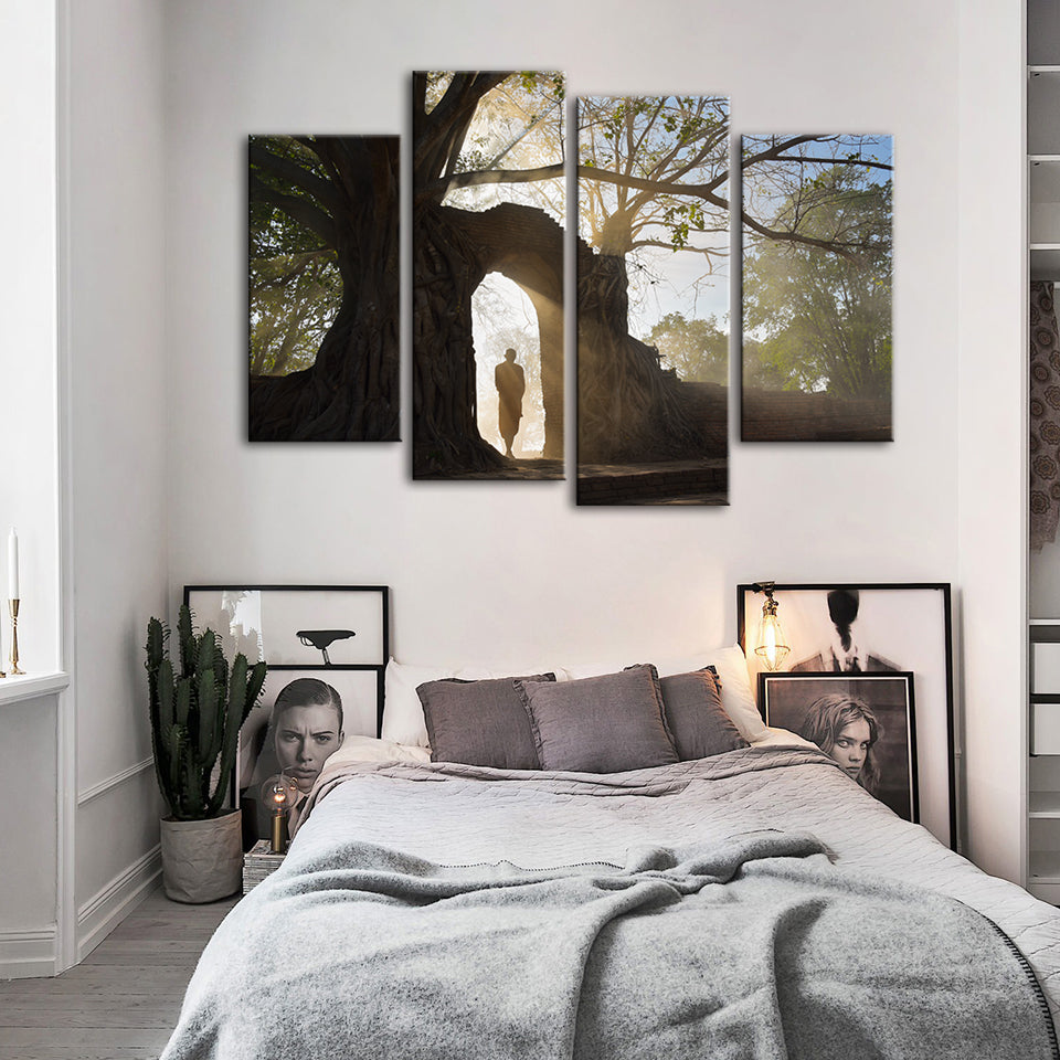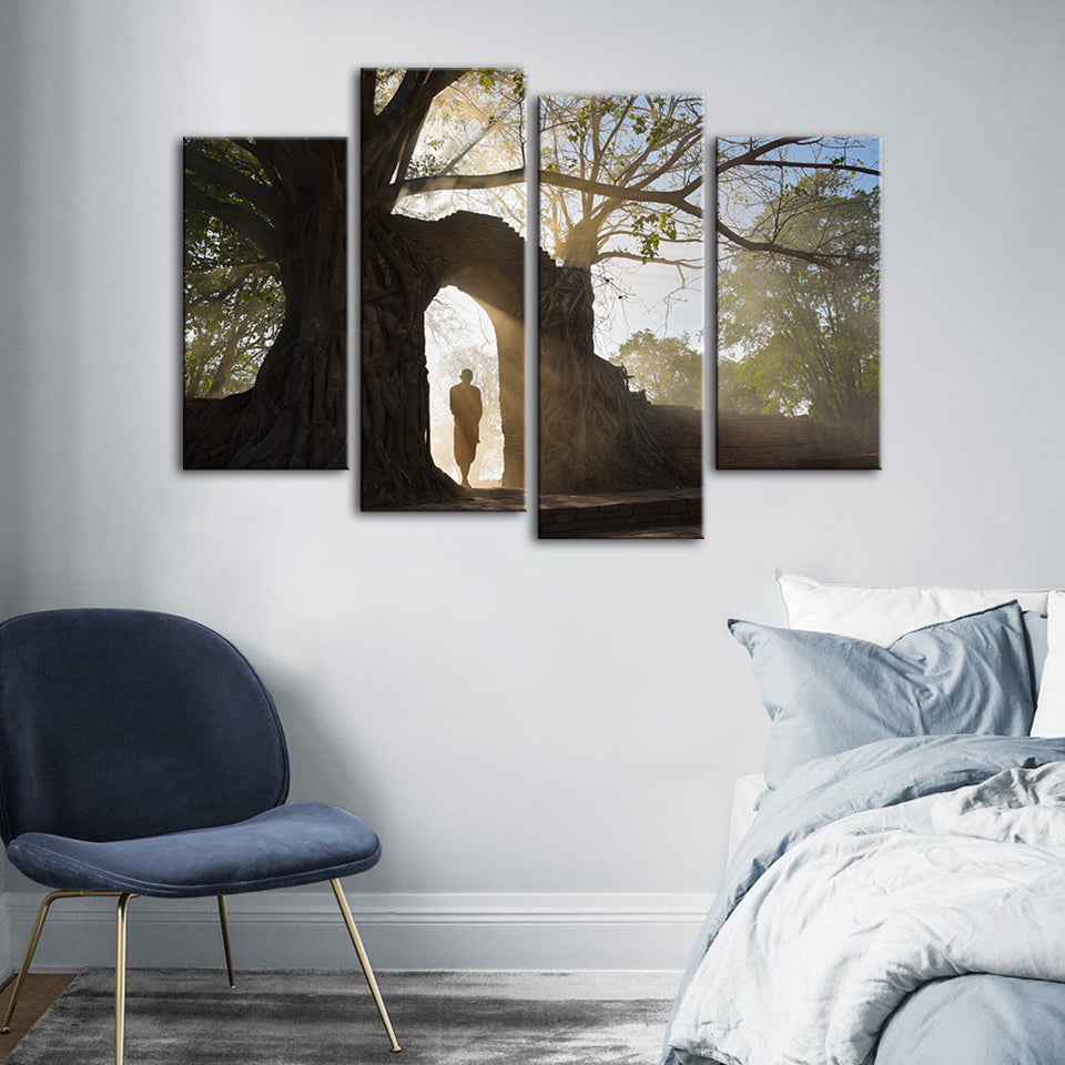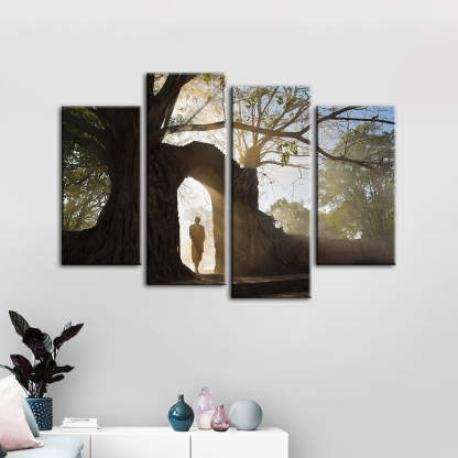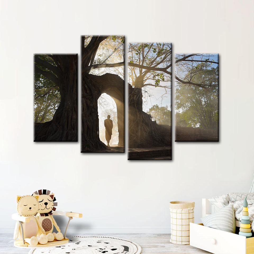 Under The Arch 4 Piece - Canvas Wall Art Painting is a premium canvas that adds a peaceful touch to your decor. The canvas features a person standing under an arch connected to two trees.