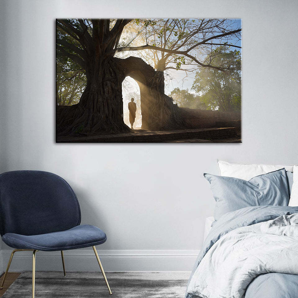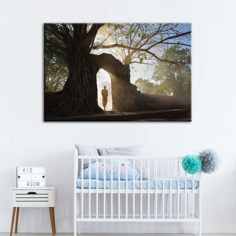Under The Arch - Canvas Wall Art Painting is a premium canvas that adds a peaceful touch to your decor. The canvas features a person standing under an arch connected to two trees.
