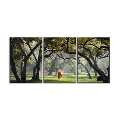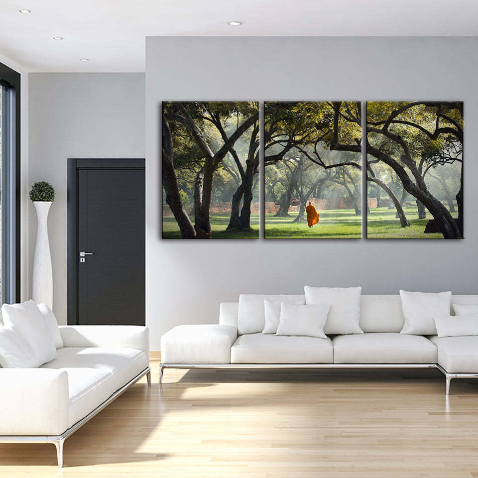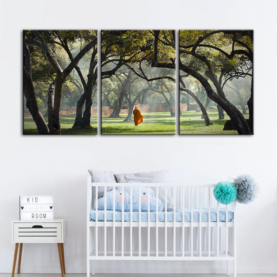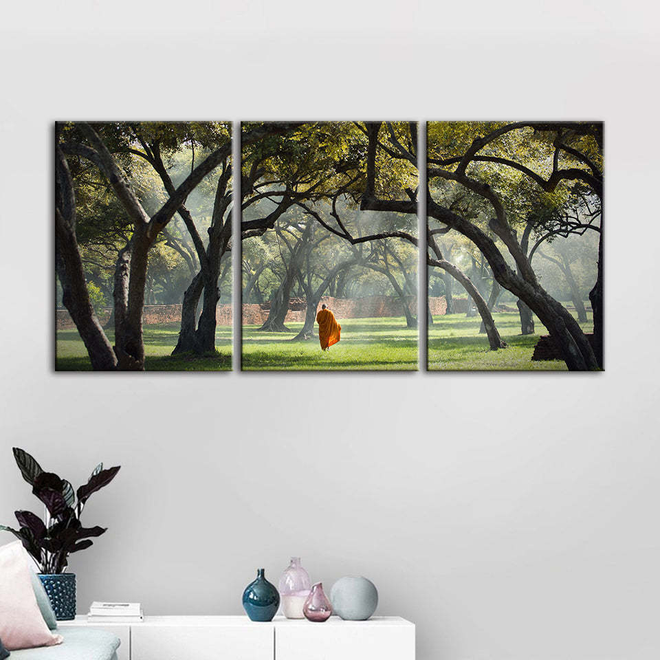 Walk The Earth 3 Piece - Canvas Wall Art Painting is a premium canvas that adds a motivating touch to your decor. The canvas features a person walking alone between the misty green trees and grass.