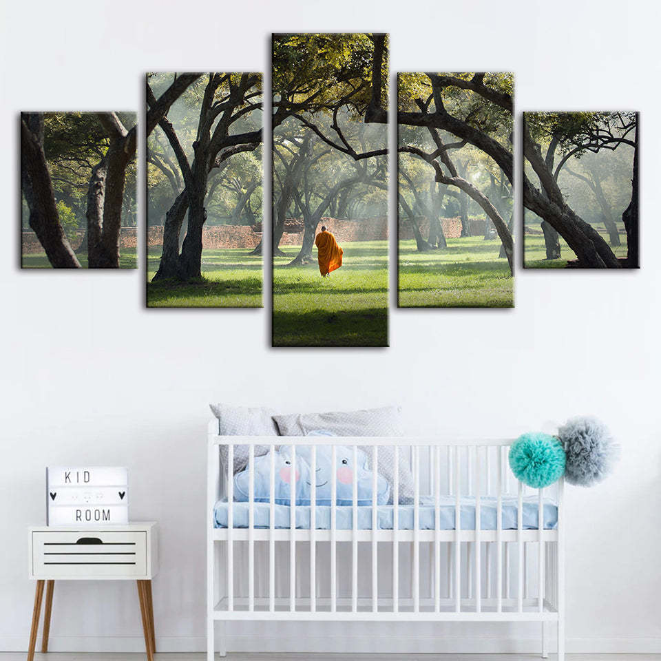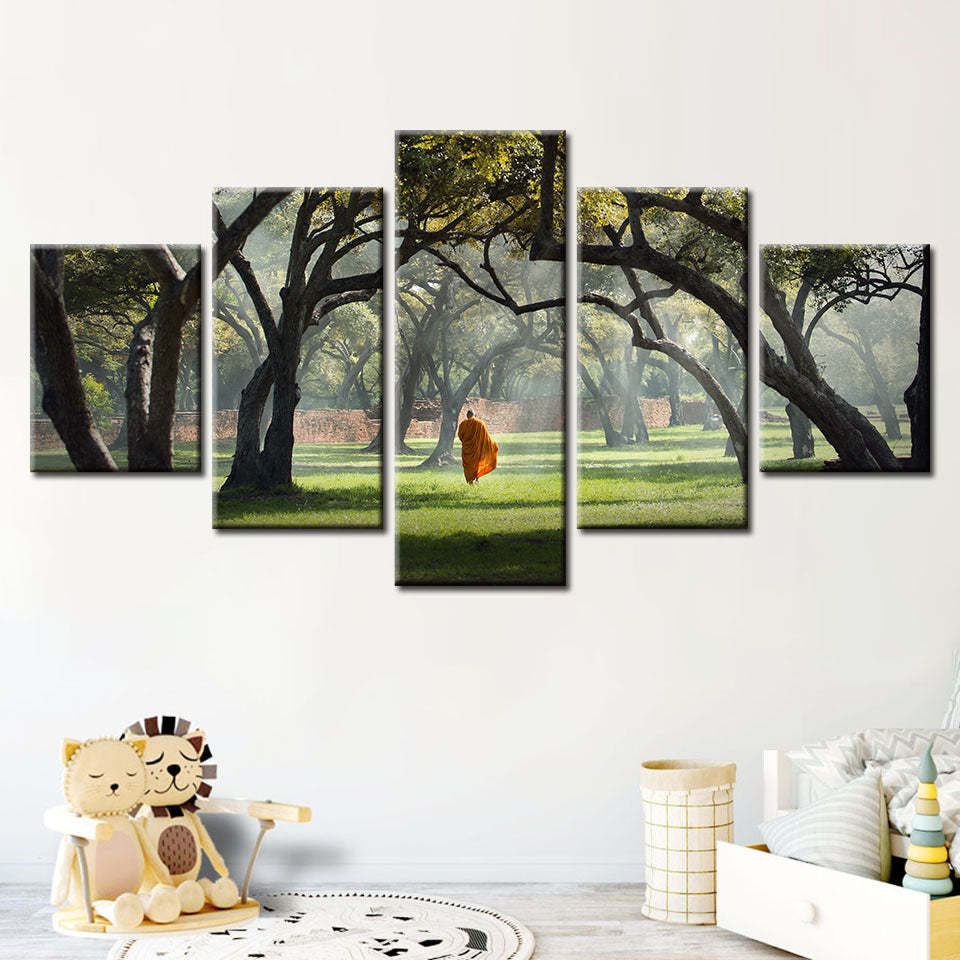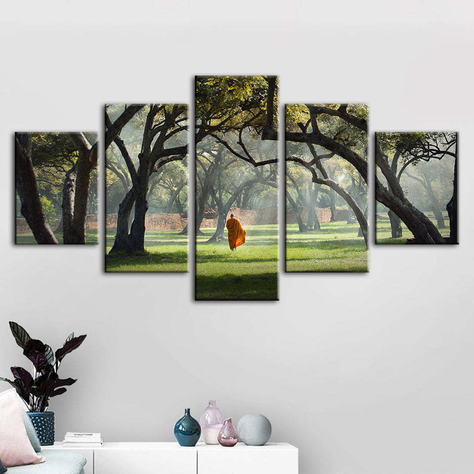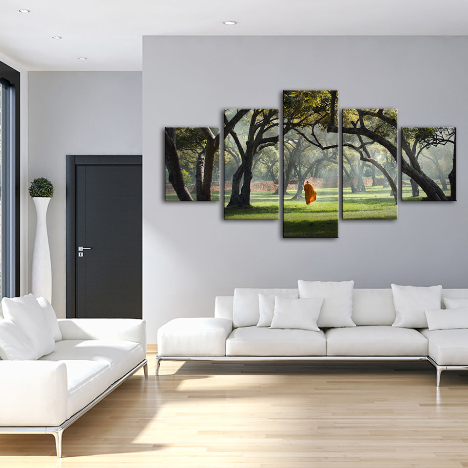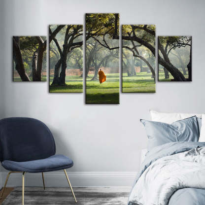 Walk The Earth 5 Piece - Canvas Wall Art Painting is a premium canvas that adds a motivating touch to your decor. The canvas features a person walking alone between the misty green trees and grass.