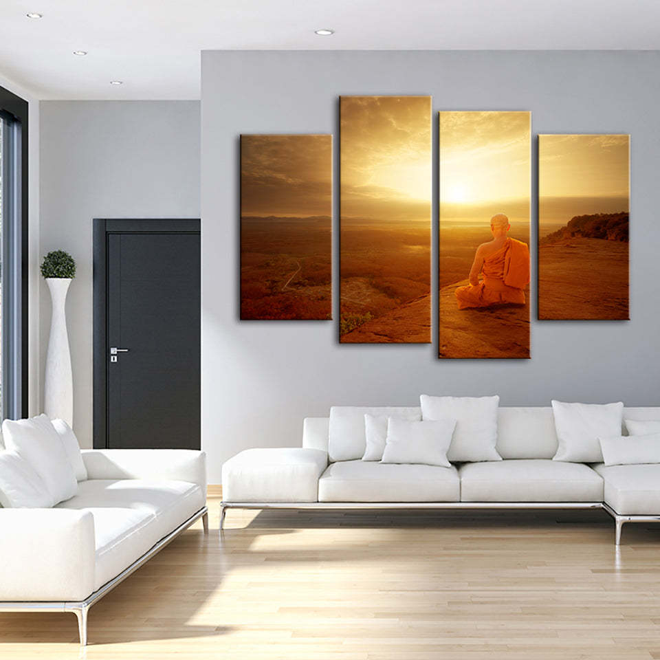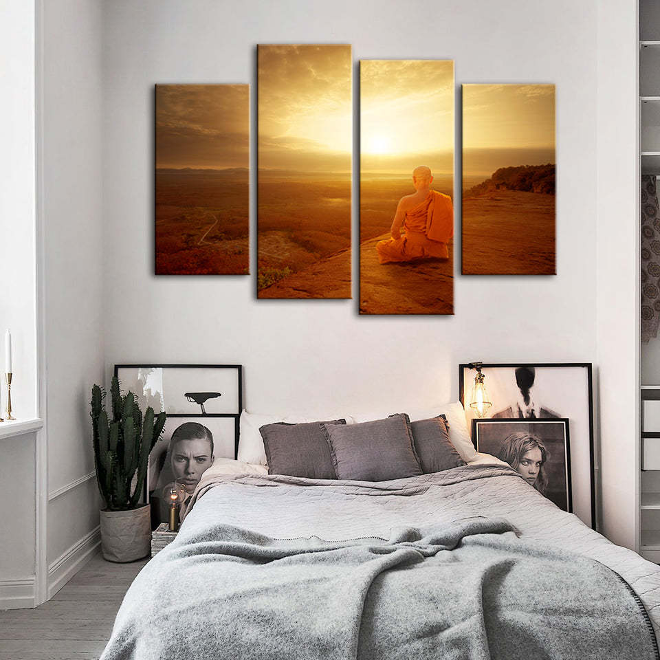 Warm Morning 4 Piece - Canvas Wall Art Painting is a premium canvas that adds a motivating touch to your decor. The canvas features a person sitting high up on a rock facing the warm sun.