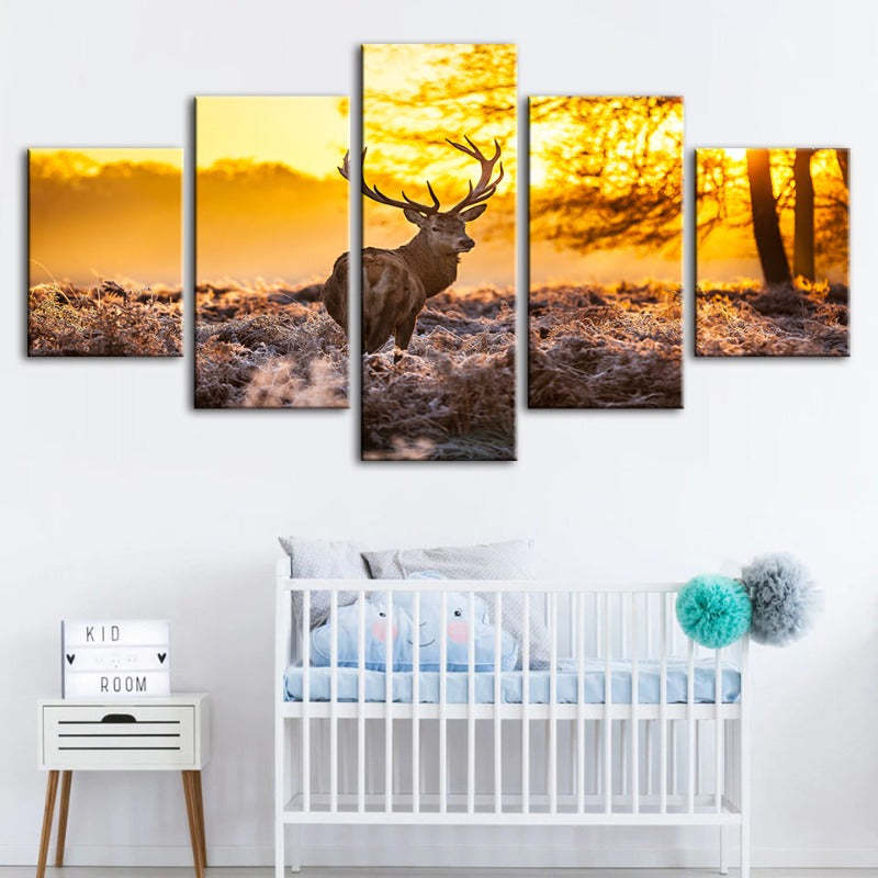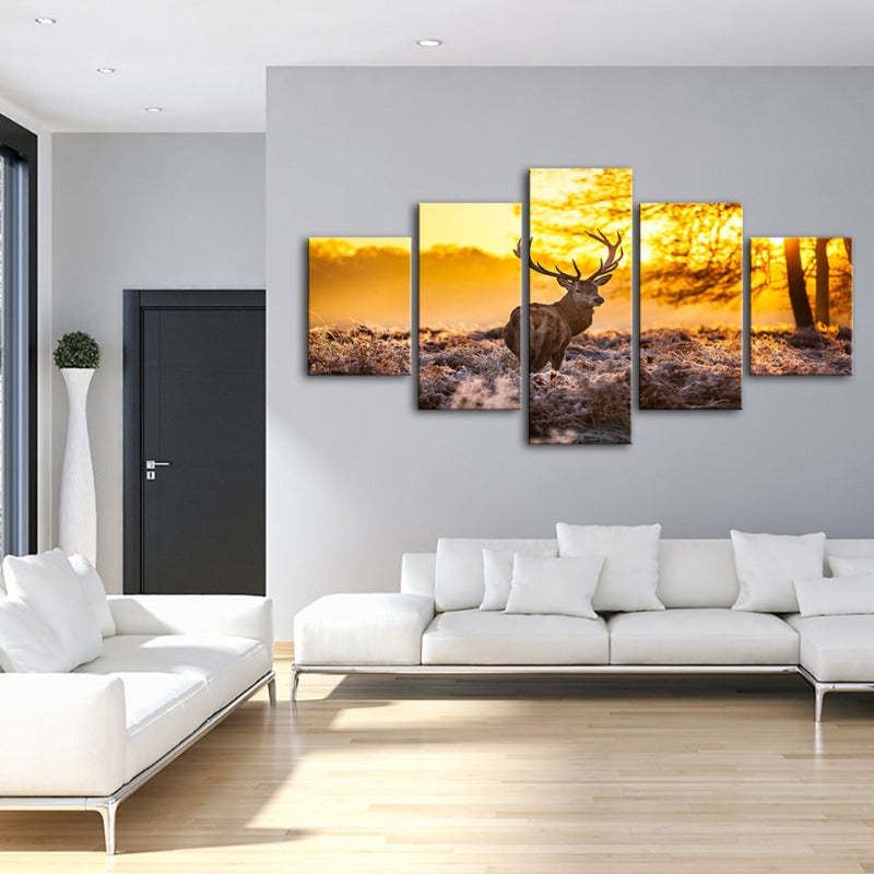Winter Deer at Dawn 5 Piece - Canvas Wall Art Painting is a premium canvas that adds a peaceful touch to your décor. The canvas features a stunning lone deer being backlit by an ethereal golden sunrise.