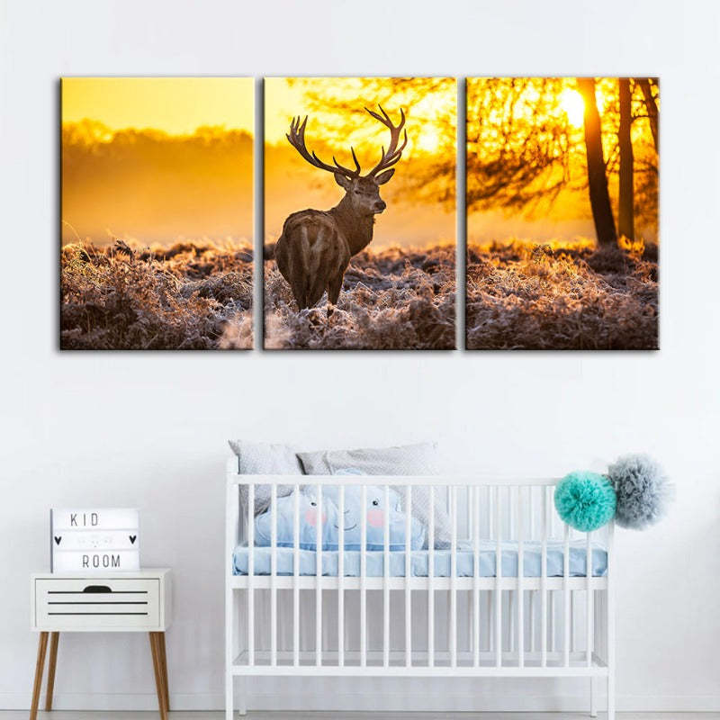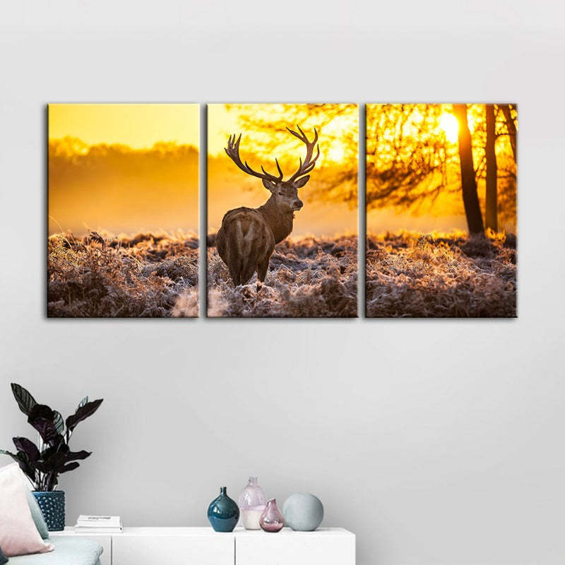 Winter Deer At Dawn-Canvas Wall Art Painting 3 Pieces is a premium canvas that adds a peaceful touch to your décor. The canvas features a stunning lone deer being backlit by an ethereal golden sunrise.